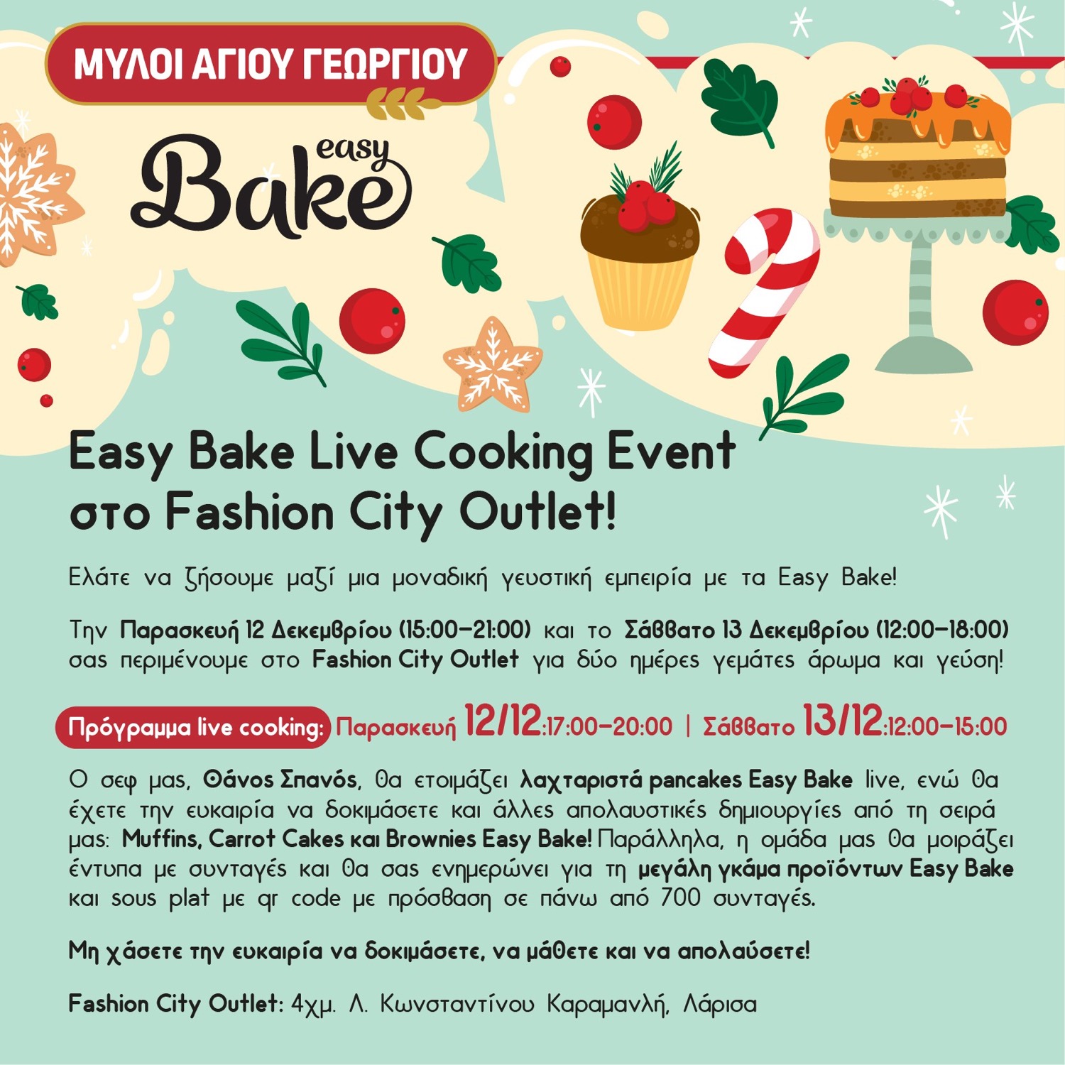 Την Παρασκευή 12 Δεκεμβρίου (17:00–20:00) και το Σάββατο 13 Δεκεμβρίου (12:00–15:00), οι μικροί μας σεφ μπαίνουν σε χριστουγεννιάτικη δράση!Ο σεφ του Easy Bake από τους Μύλους Αγ. Γεωργίου ετοιμάζει λαχταριστά pancakes live, ενώ τα παιδιά μπορούν να δοκιμάσουν και άλλα Easy Bake προϊόντα που έχουν ετοιμαστεί ειδικά για το event. Παράλληλα, η ομάδα του Easy Bake μοιράζει ιδέες, έμπνευση και έντυπα με εύκολες συνταγές για όλη την οικογένεια..