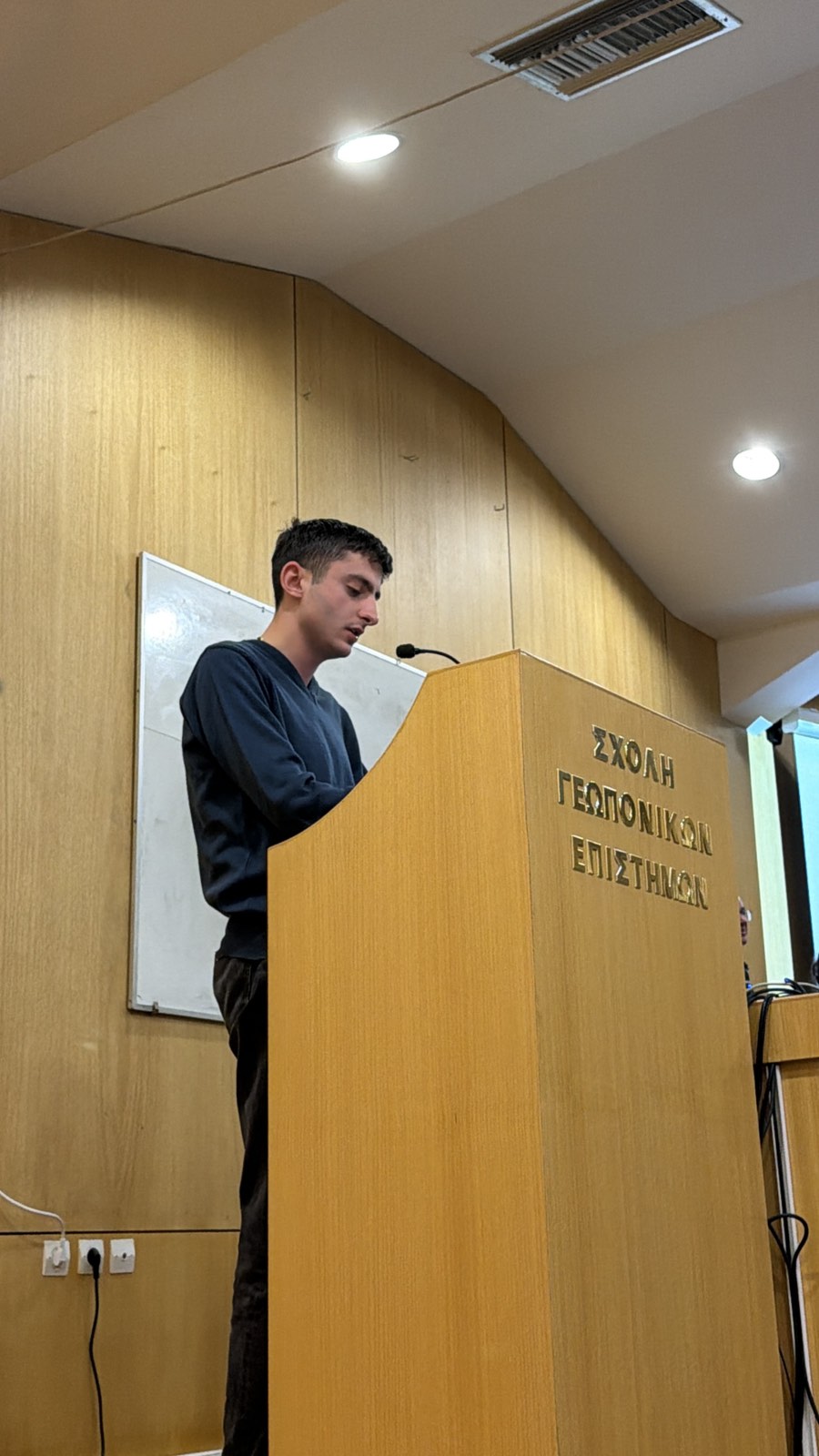 Στον σύντομο χαιρετισμό του, ο Πρόεδρος του Φοιτητικού Συλλόγου υπογράμμισε τη σημασία της ουσιαστικής σύνδεσης της ακαδημαϊκής εκπαίδευσης με τον πρωτογενή τομέα και τις σύγχρονες ανάγκες της αγροδιατροφικής παραγωγής.