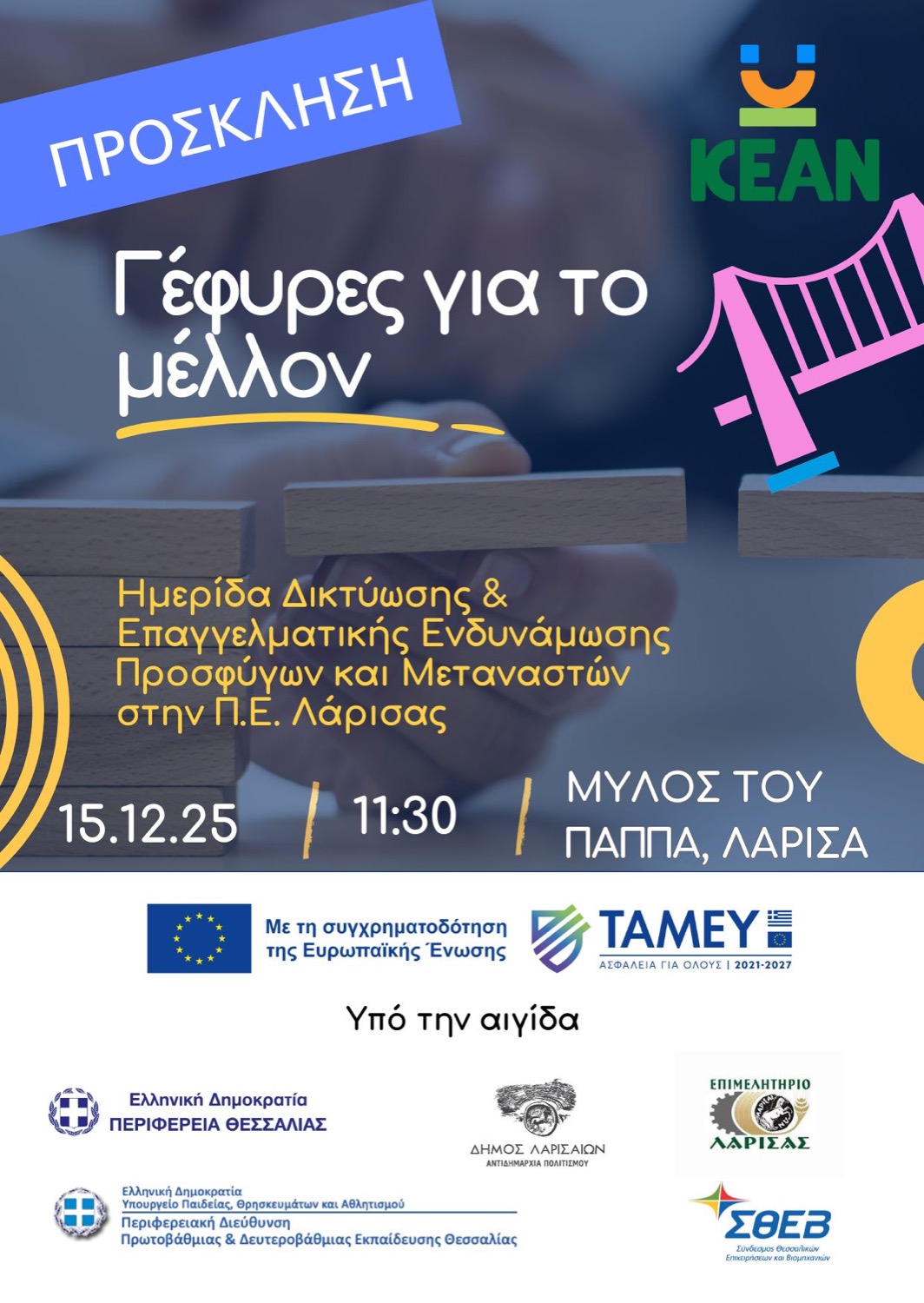 Το «Κύτταρο Εναλλακτικών Αναζητήσεων (Κ.Ε.ΑΝ.) – ΚΦΑΑ Λάρισας» διοργανώνει εκδήλωση με θέμα «Γέφυρες για το Μέλλον», η οποία θα πραγματοποιηθεί στις 15 Δεκεμβρίου 2025, από τις 11:30 πμ. έως τις 15:30 μμ., στο Αμφιθέατρο Μύλου του Παππά στη Λάρισα.