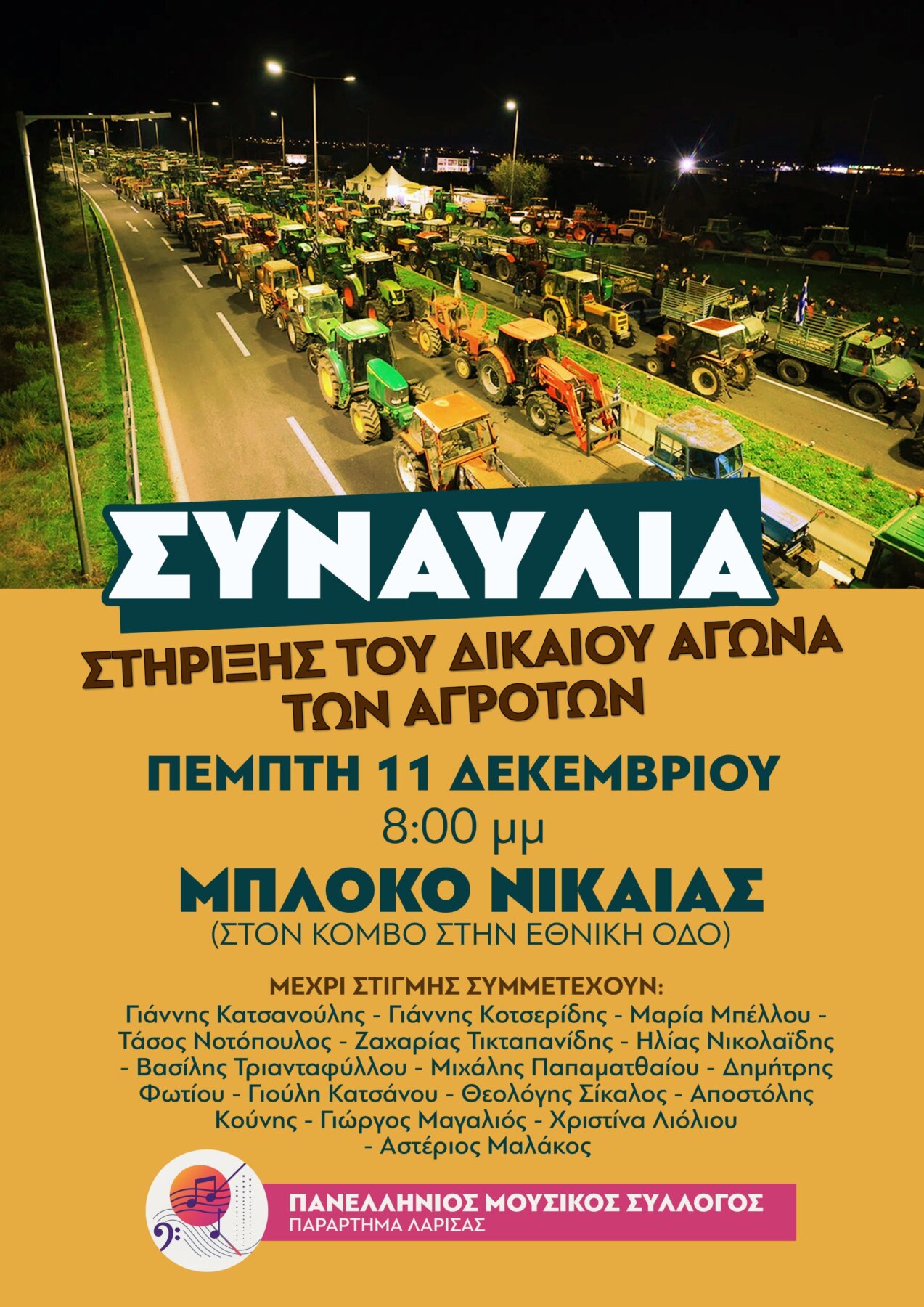 Ο Πανελλήνιος Μουσικός Σύλλογος – παράρτημα Λάρισας δίπλα στους αγρότες – Σήμερα η συναυλία αλληλεγγύης στο μπλόκο της Νίκαιας