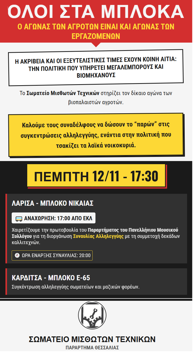 Το Σωματείο Μισθωτών Τεχνικών με ανακοίνωσή του στηρίζει τον δίκαιο αγώνα των βιοπαλαιστών αγροτών. Αναλυτικά: