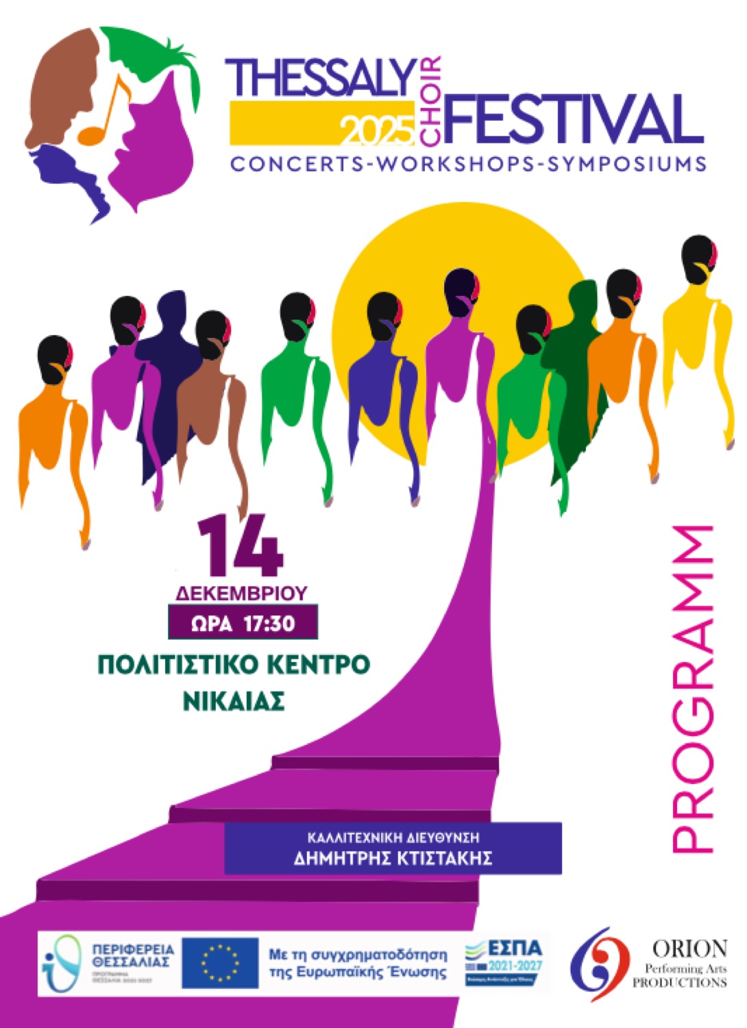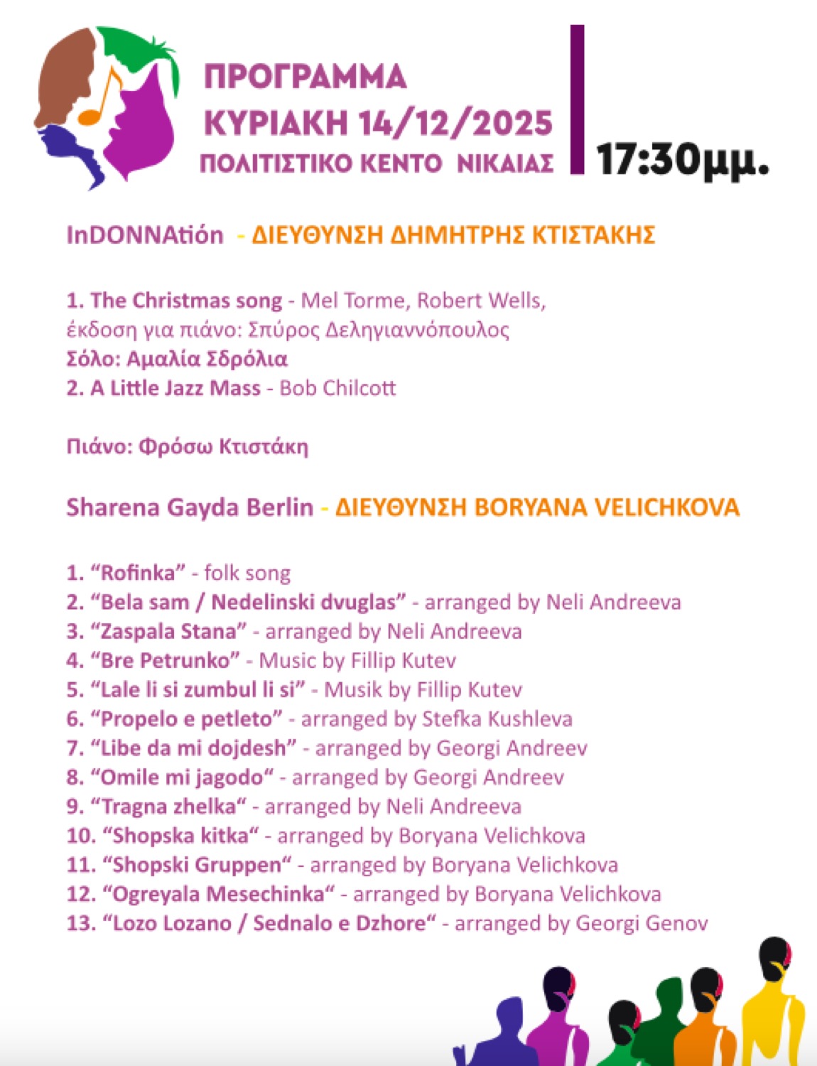 14 Δεκεμβρίου 2025: 2η Ημέρα του χορωδιακού φεστιβάλ Thessaly Choir Festival (Χώρος διεξαγωγής: Πολιτιστικό Κέντρο Νίκαιας) Συμμετέχουν οι χορωδίες: “InDONNAtiόn”, “Sharena Gayda Berlin”