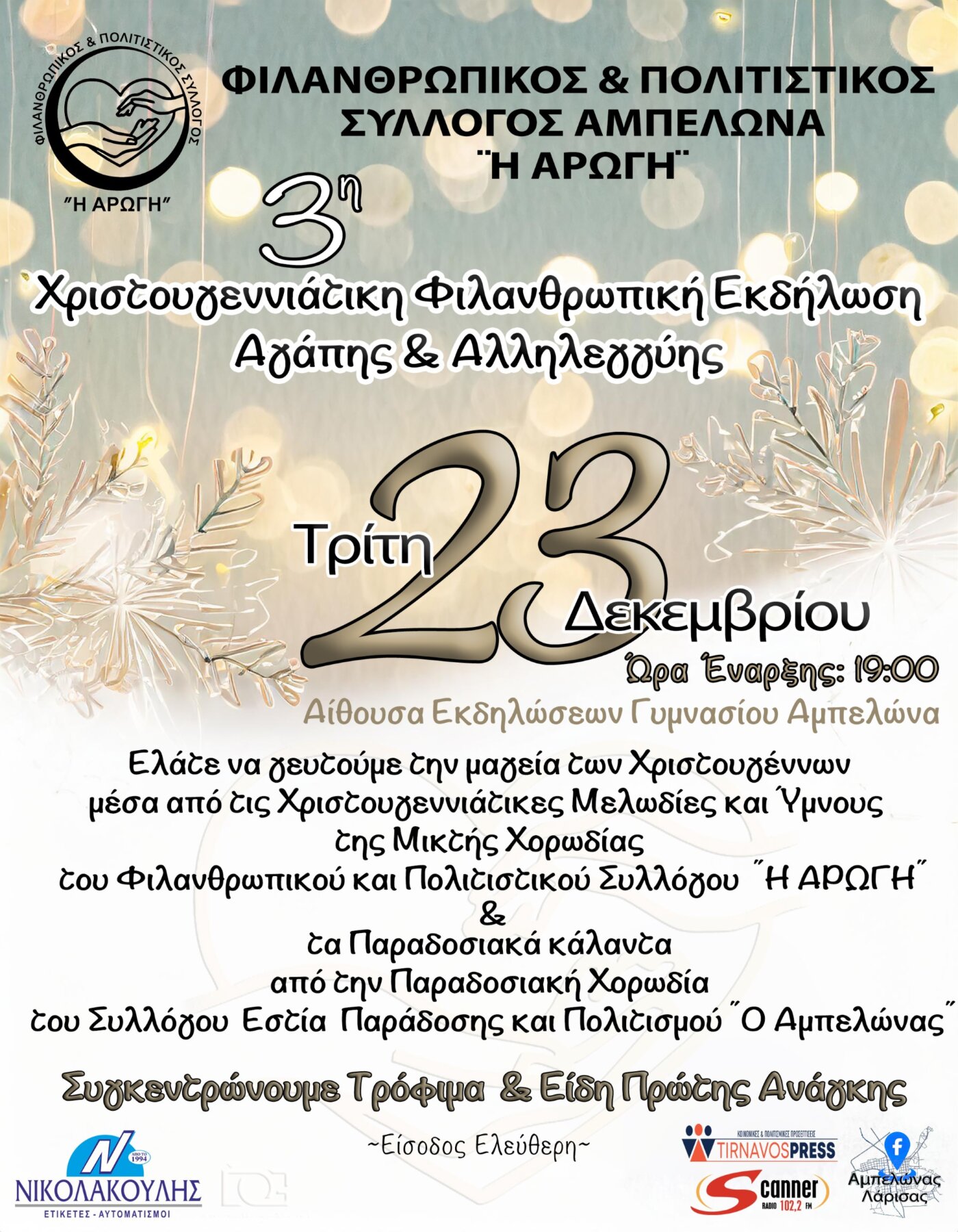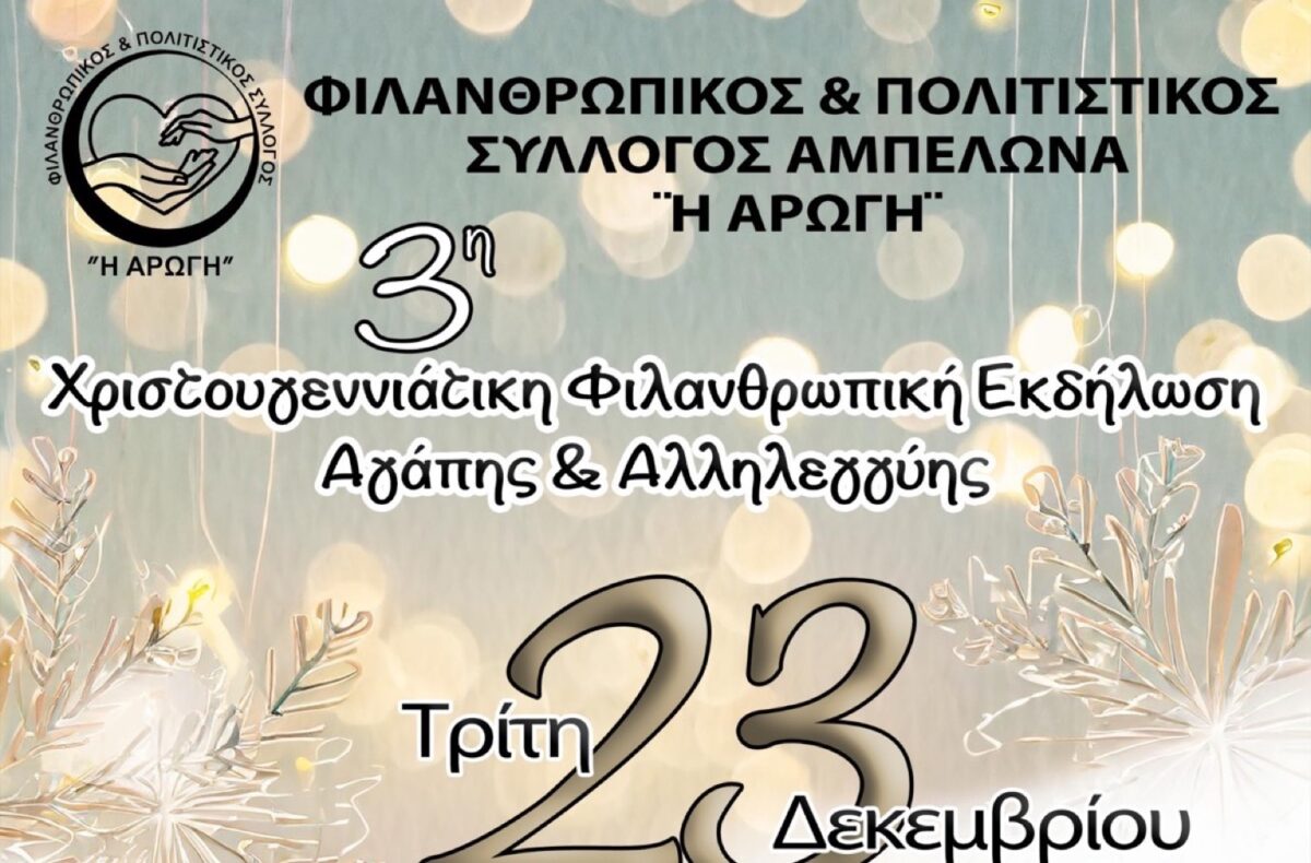 Ο Φιλανθρωπικός και Πολιτιστικός Σύλλογος ¨Η ΑΡΩΓΗ¨ Αμπελώνα προσκαλεί τους απανταχού πολίτες στην Χριστουγεννιάτικη Φιλανθρωπική Εκδήλωση Αγάπης και Αλληλεγγύης την Τρίτη 23 Δεκεμβρίου 2025 και ώρα 19:00 στην αίθουσα εκδηλώσεων του Γυμνασίου Αμπελώνα.