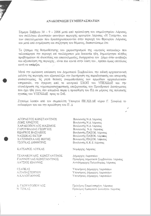 Στις 30/9/2006 πραγματοποιήθηκε κοινή σύσκεψη για το θέμα με ταυτόχρονη πρωτοβουλία του Επιμελητηρίου Λάρισας που εκπροσωπούσε τους επαγγελματίες της περιοχής και του Συλλόγου ιδιοκτητών ακινήτων Φρουρίου, παρουσία Βουλευτών όλων των κομμάτων, του Δημάρχου Λαρισαίων κ. Τζανακούλη, εκπροσώπων της Νομαρχιακής αυτοδιοίκησης, υποψηφίων δημάρχων και λοιπών εκπροσώπων φορέων. Στην σύσκεψη αυτή αποφασίστηκε ομόφωνα ότι το σχετικό ψήφισμα θα αποστέλλονταν προς τον κ. Σουφλιά, υπουργό ΥΠΕΧΩΔΕ και ότι ταυτόχρονα υποβαλλόταν αίτημα συνάντησης του Υπουργού με εκπροσώπους των ιδιοκτητών ακινήτων, των επαγγελματιών, του επιμελητηρίου αλλά και του Δήμου Λαρισαίων σε σύντομο χρονικό διάστημα ώστε να έχουμε ενημέρωση για την περαιτέρω πορεία του θέματος.
