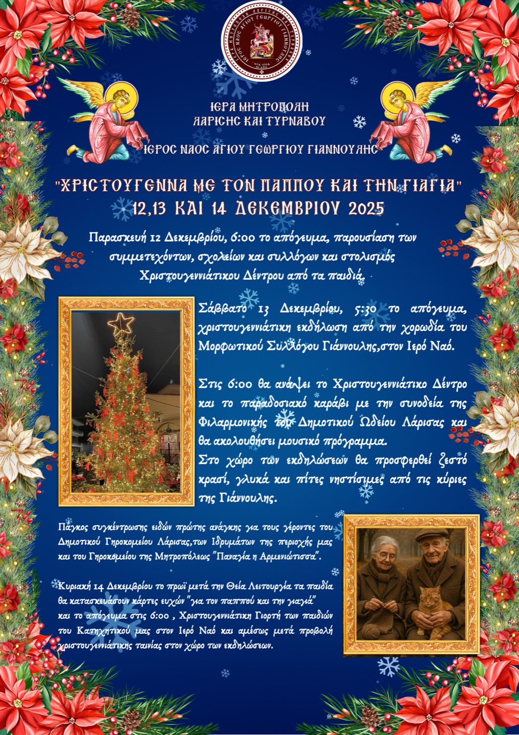 Ο Ιερός Ναός Αγίου Γεωργίου Γιάννουλης θα πραγματοποιήσει Χριστουγεννιάτικες εκδηλώσεις το τριήμερο 12, 13 και 14 Δεκεμβρίου.