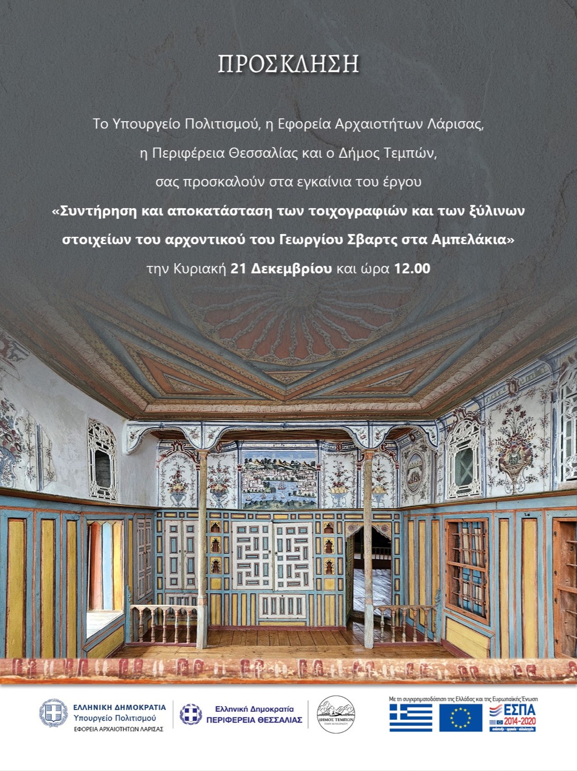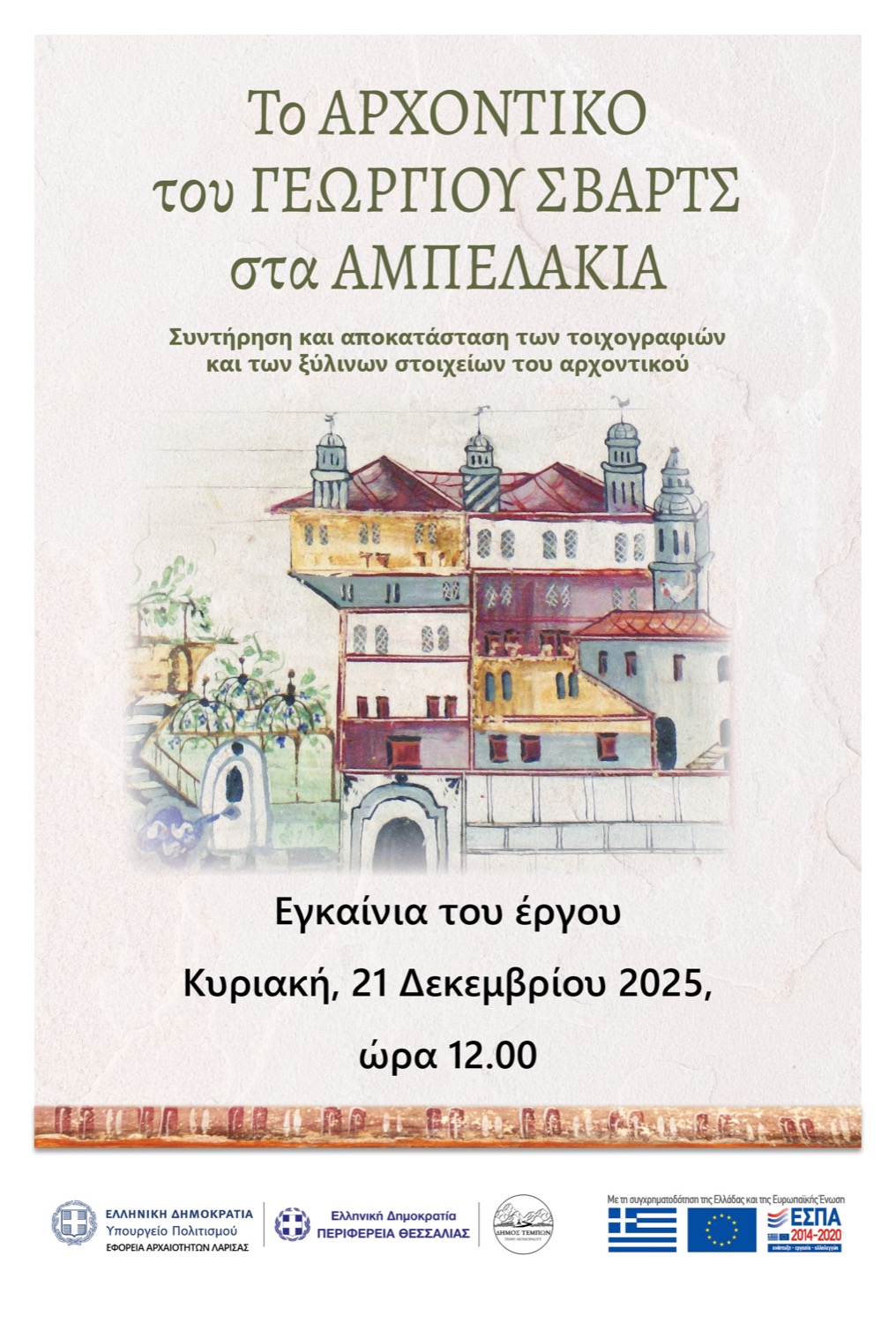 ην Κυριακή 21 Δεκεμβρίου 2025 στις 12.00 το μεσημέρι θα τελεσθούν τα επίσημα εγκαίνια του Αρχοντικού του Γεωργίου Σβαρτς στα Αμπελάκια, μετά την ολοκλήρωση των εκτεταμένων εργασιών συντήρησης και ανάδειξης του μνημείου, που πραγματοποιήθηκαν με τη χρηματοδότηση του ΕΣΠΑ Θεσσαλίας 2014-2020.