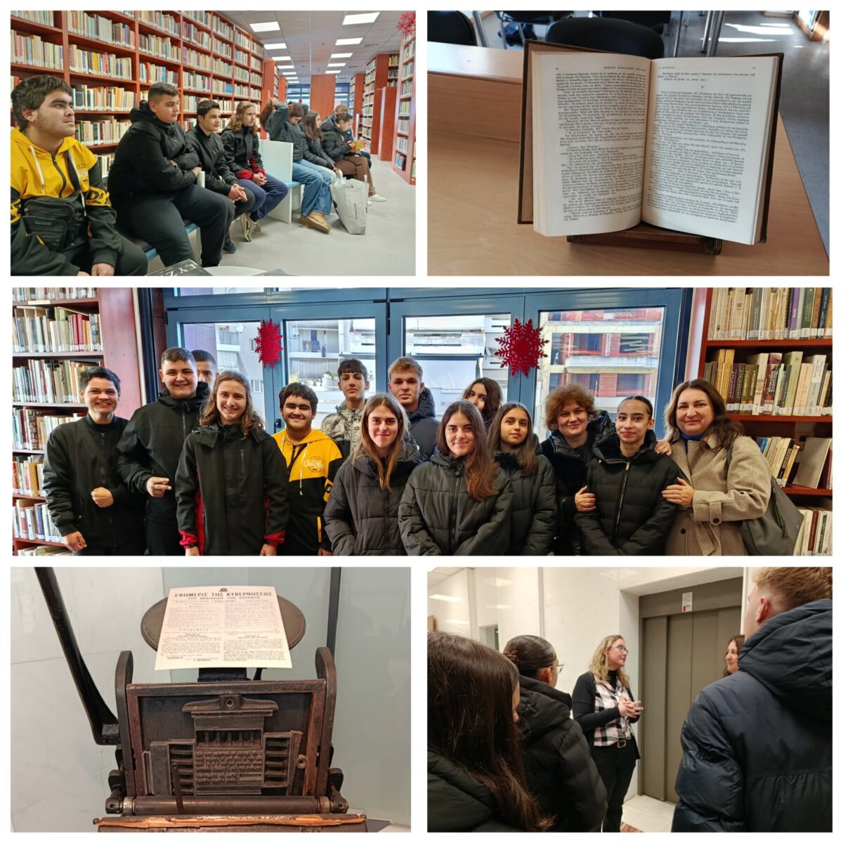 Η διδακτική επίσκεψη ολοκληρώθηκε με τη ξενάγηση στην Δημόσια Κεντρική Βιβλιοθήκη. Οι μαθητές /τριες ενημερώθηκαν για τη λειτουργία της, για τον τρόπο δανεισμού αλλά και το πώς μπορούν να εγγραφούν ως μέλη της. Έμαθαν για το πλήθος της συγγραφικής συλλογής αλλά και για την παλαιότητα αυτής (το παλαιότερο βιβλίο χρονολογείται στο 1512 μ.Χ.). Διδάχθηκαν για το GraphicNovel, ένα νέο είδος αφήγησης με εικόνες τύπου comic. Η υπεύθυνη εξήρε την σημασία της ύπαρξης μιας Δημόσιας Βιβλιοθήκης και παρότρυνε τους μαθητές/τριες να διαβάζουν βιβλία.