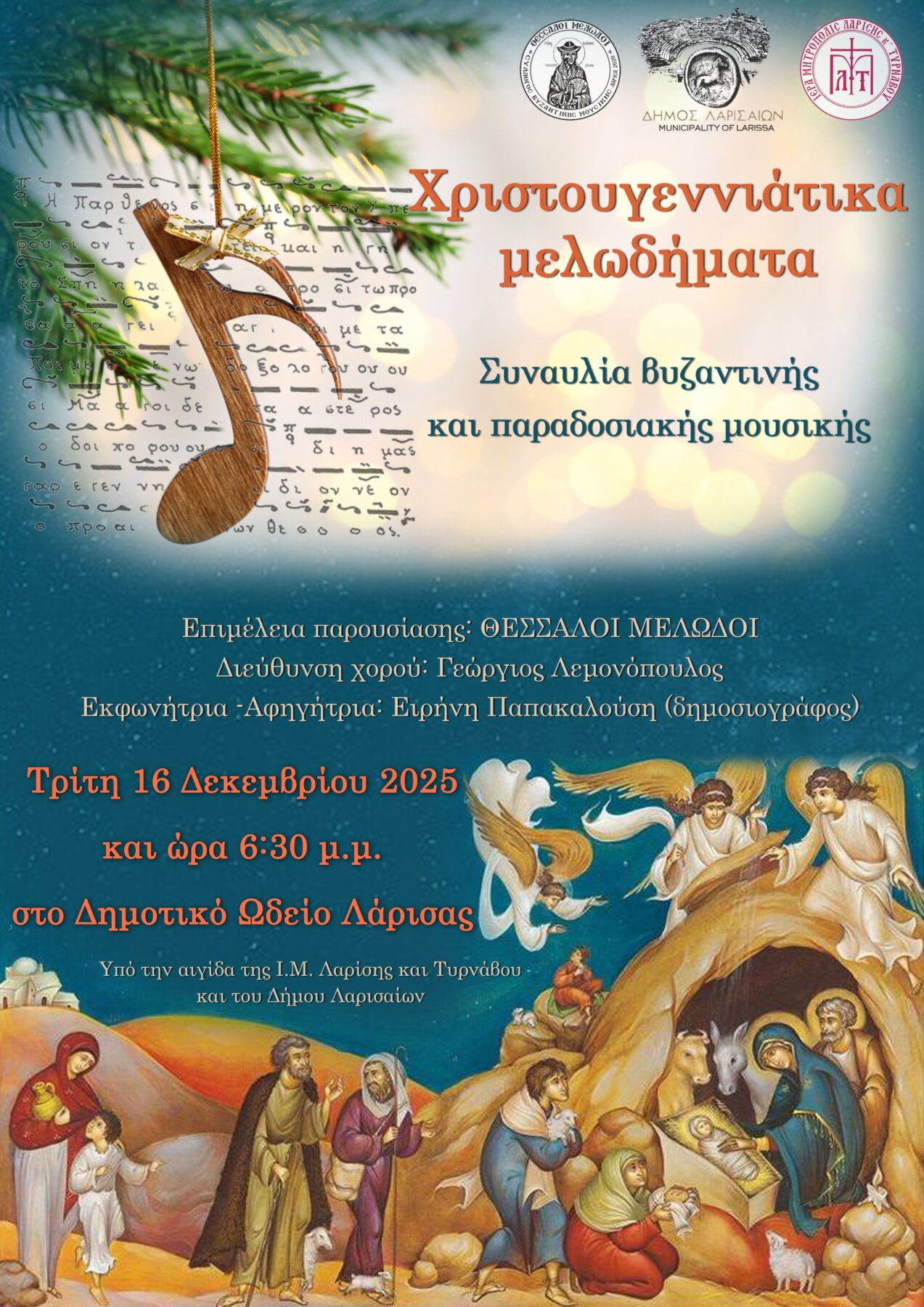 Ο Σύλλογος βυζαντινής μουσικής «Θεσσαλοί Μελωδοί» διοργανώνουν την εορταστική εκδήλωση – συναυλία βυζαντινής και παραδοσιακής μουσικής της χορωδίας του Συλλόγου αύριο Τρίτη 16 Δεκεμβρίου 2025 και ώρα 6:30 μ.μ. στο Δημοτικό Ωδείο Λάρισας.