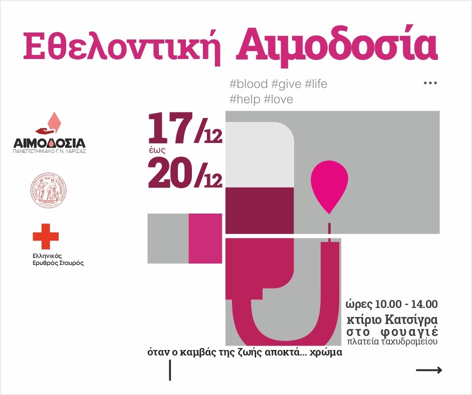 Η Ν. Υ Αιμοδοσίας του Πανεπιστημιακού Νοσοκομείου Λάρισας ανακοινώνει τη διοργάνωση Εθελοντικής Αιμοδοσίας στο Φουαγιέ του Κτηρίου Κατσίγρα, στην Πλατεία Ταχυδρομείου με στόχο την ενίσχυση των αποθεμάτων αίματος και την κάλυψη των αυξημένων αναγκών της περιόδου των γιορτών. Η δράση θα πραγματοποιηθεί από την Τετάρτη 17 Δεκεμβρίου 2025 έως και το Σάββατο 20 Δεκεμβρίου 2025, από τις 10:00 το πρωί έως τις 14:00 το μεσημέρι. Η εθελοντική αιμοδοσία αποτελεί πράξη υψηλής κοινωνικής ευθύνης και αλληλεγγύης.