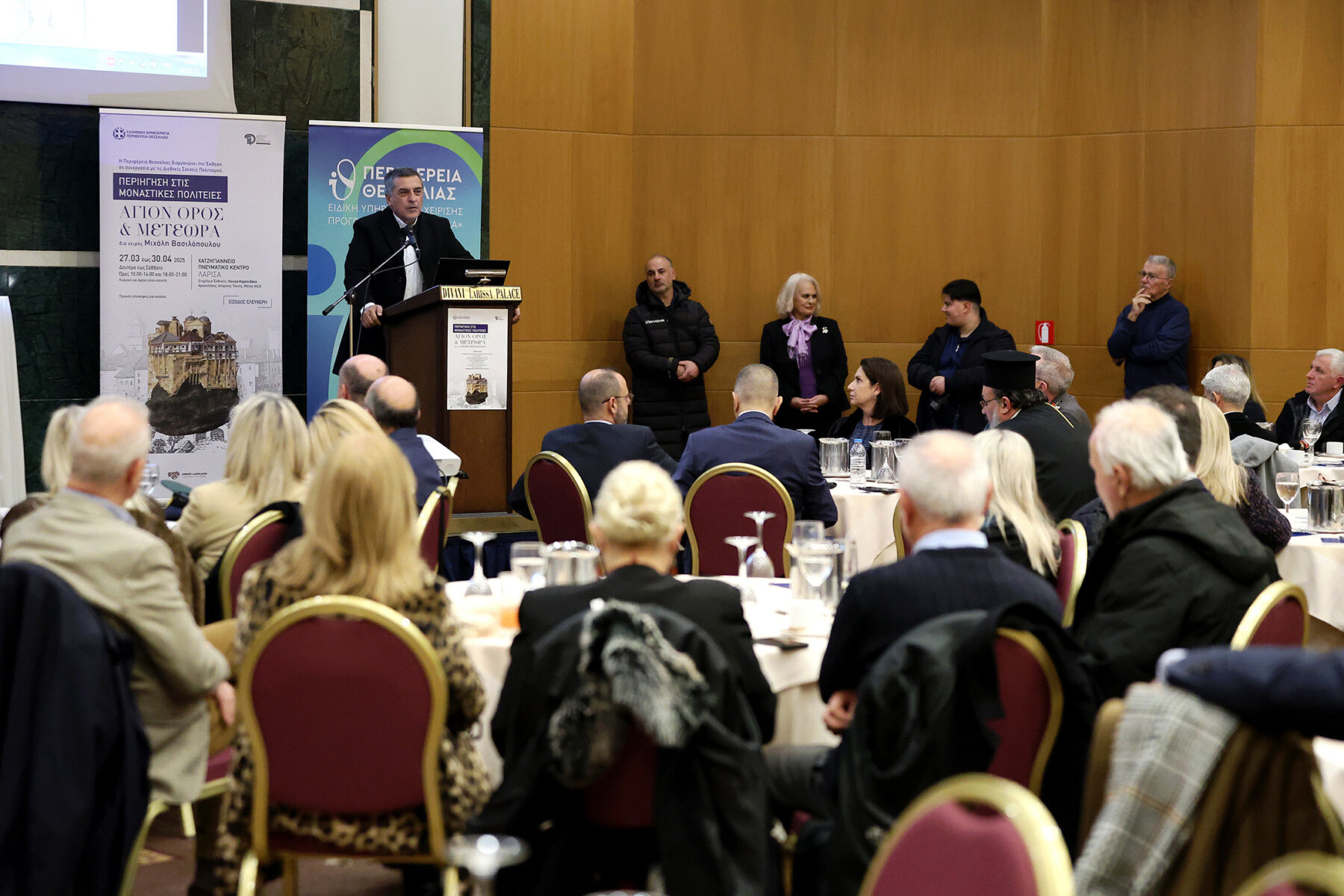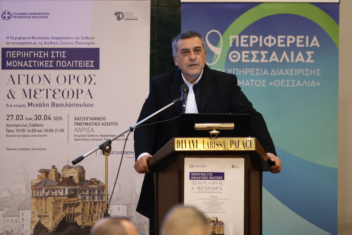 Με μια εκδήλωση ιδιαίτερης σημασίας ολοκληρώθηκε ο κύκλος των παράλληλων δράσεων της Έκθεσης «Περιήγηση στις Μοναστικές Πολιτείες – Άγιον Όρος & Μετέωρα», η οποία παρουσιάστηκε με μεγάλη επιτυχία στη Λάρισα. Η Περιφέρεια Θεσσαλίας, σε συνεργασία με τις Διεθνείς Σχέσεις Πολιτισμού, διοργάνωσε το βράδυ της Τρίτης στο ξενοδοχείο Divani Palace την τελική εκδήλωση, με κεντρικό ομιλητή τον κ. Αλκιβιάδη Στεφανή, Διοικητή του Αγίου Όρους, τ. Υπουργό Εθνικής Άμυνας, Στρατηγό ε.α. και Επίτιμο Αρχηγό ΓΕΣ, ο οποίος ανέπτυξε το θέμα: «Θρησκευτική διπλωματία και Άγιο Όρος». Ανοίγοντας την εκδήλωση, ο Περιφερειάρχης Θεσσαλίας κ. Δημήτρης Κουρέτας επισήμανε ότι «η αγιορείτικη ζωή αποτελεί τον πυρήνα της Ορθοδοξίας». Τόνισε πως, πέρα από την αφοσίωση στον Θεό, προβάλλονται πανανθρώπινες αξίες, όπως ο λιτός τρόπος ζωής, η διατροφή και η απόσυρση από πράγματα που δεν έχουν ουσιαστικό ενδιαφέρον, υπογραμμίζοντας ότι το Άγιο Όρος μπορεί να λειτουργεί διαχρονικά ως παράδειγμα. Πρόσθεσε, μάλιστα, ότι ως καθηγητής έχει μελετήσει ιδιαίτερα το ζήτημα της νηστείας και της αγιορείτικης διατροφής. Ο Περιφερειάρχης σημείωσε επίσης ότι αυτή η προσέγγιση στο Άγιο Όρος θα αποτελέσει αντικείμενο και του δεύτερου κύκλου εκδηλώσεων, ο οποίος θα ξεκινήσει με τη νέα χρονιά.