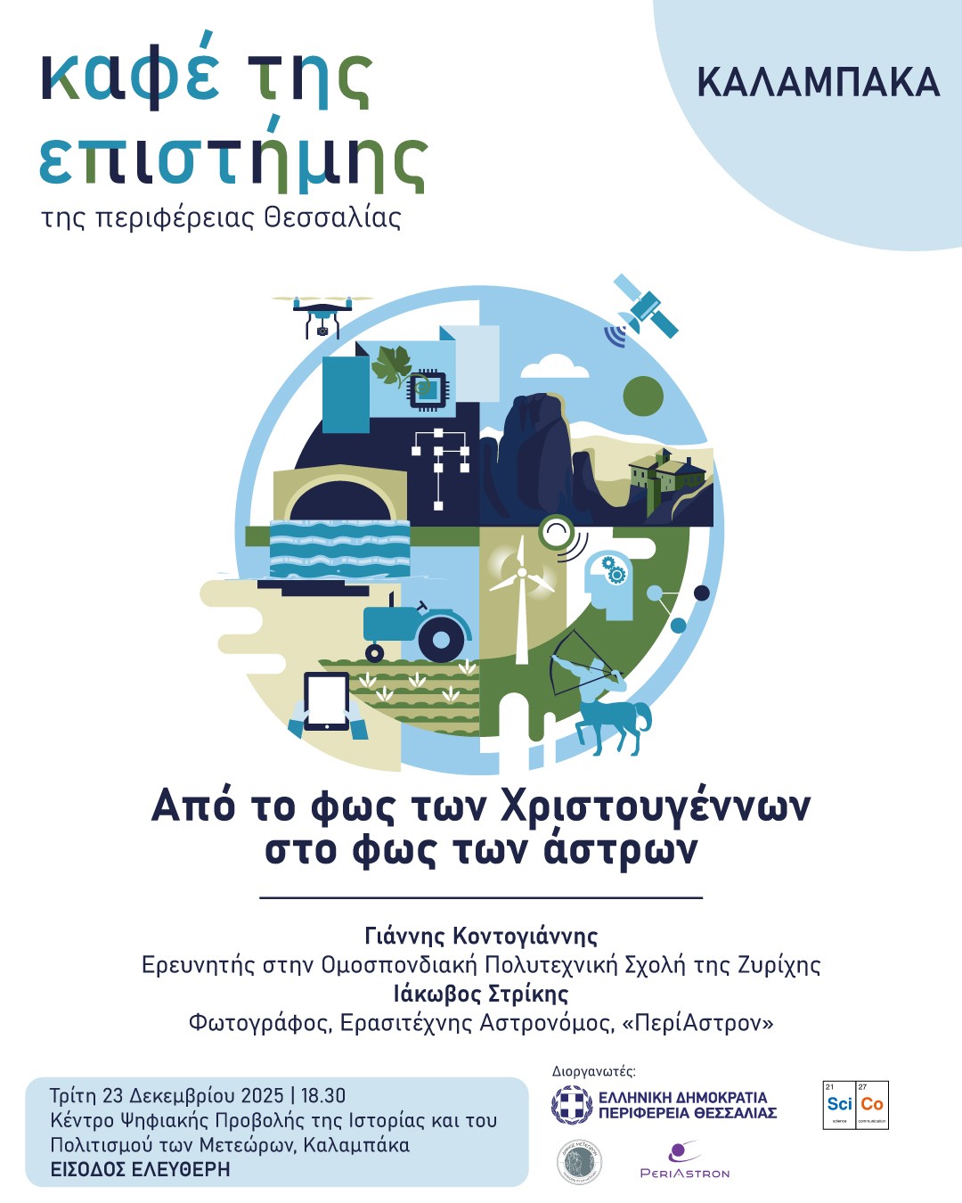 Η Περιφέρεια Θεσσαλίας, σε συνεργασία με τον εκπαιδευτικό μη κερδοσκοπικό οργανισμό «SciCo – Επιστήμη Επικοινωνία», συνεχίζει το «Καφέ της Επιστήμης της Περιφέρειας Θεσσαλίας», μια σειρά ανοιχτών εκδηλώσεων που φέρνουν την επιστήμη πιο κοντά στους πολίτες, μέσα από προσιτές και ενδιαφέρουσες ομιλίες σε πόλεις και κωμοπόλεις της Θεσσαλίας.
