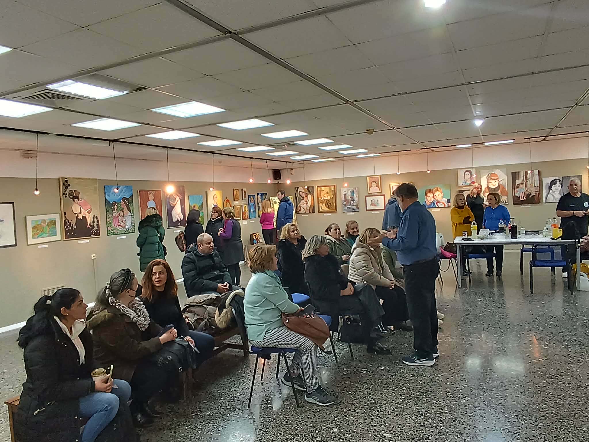 Αρχικά, ο Πρόεδρος του Συλλόγου Εικαστικών κ. Γιάννης Γεωργιάδης υποδέχτηκε τους εκπαιδευομένους και έκανε μια γενική εισήγηση για την όλη έκθεση. Στη συνέχεια, τους επισκέπτες ξενάγησαν στον χώρο κάποιοι από τους καλλιτέχνες, οι οποίοι ένας ένας χωριστά παρουσίασαν τα έργα τους, μίλησαν συνοπτικά για την έμπνευσή τους, τις τεχνοτροπίες που ακολούθησαν και τους χρωματικούς συνδυασμούς που χρησιμοποίησαν. Οι εκπαιδευόμενοι ενθουσιάστηκαν από τα έργα, έβγαλαν φωτογραφίες, συγχάρηκαν τους παριστάμενους καλλιτέχνες, ενώ έλυσαν πολλές απορίες τους με τη συζήτηση που είχαν μαζί τους.