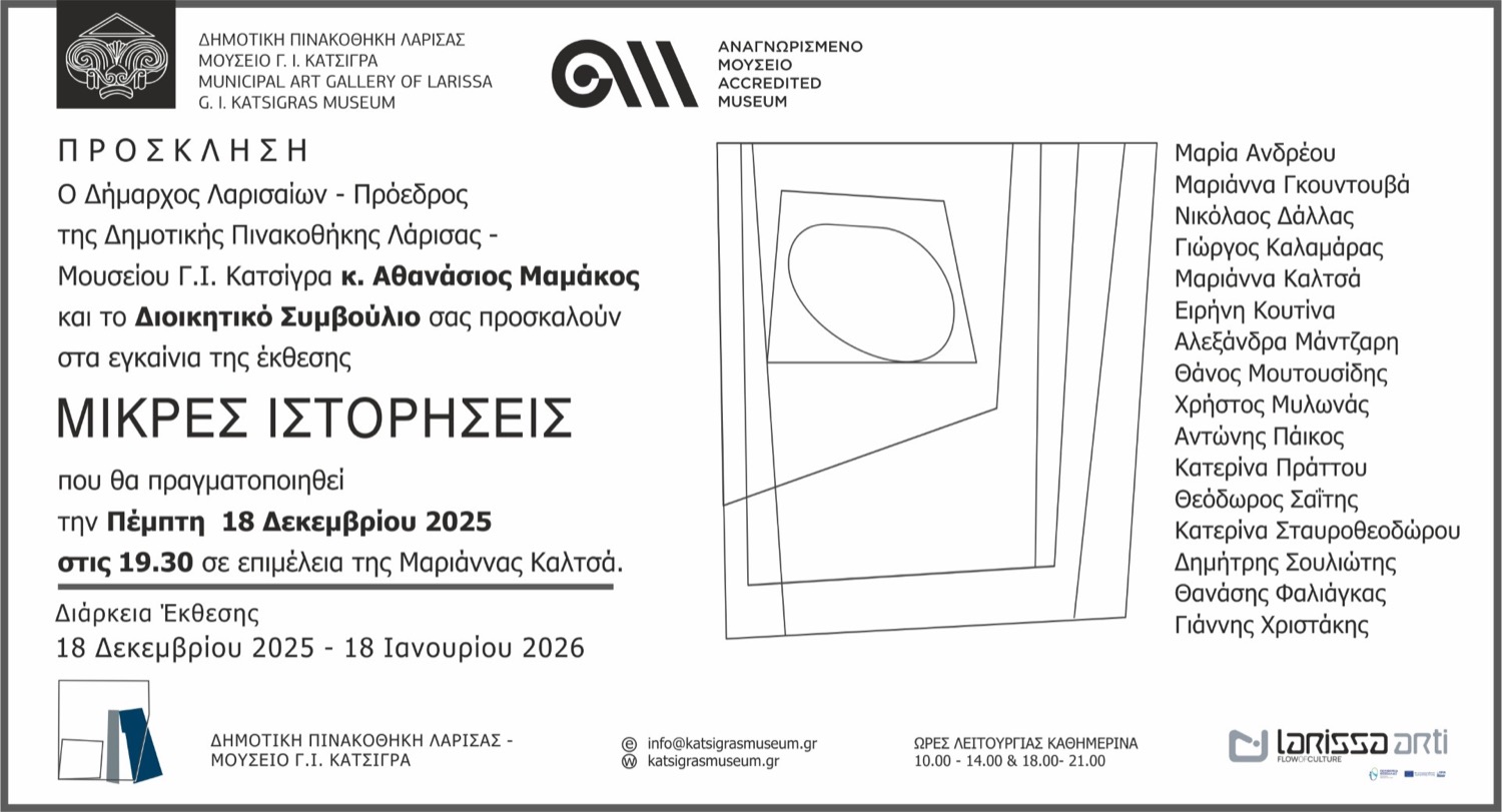 Οι «Μικρές Ιστορήσεις» παρουσιάζονται στη Δημοτική Πινακοθήκη Λάρισας Μουσείο Γ. Ι. Κατσίγρα από τις 17 Δεκεμβρίου έως τις 18 Ιανουαρίου 2026. Πρόκειται για μια έκθεση παραγωγή του Μουσείου που παρουσιάζει επιλεγμένους καλλιτέχνες σε μια απόπειρα χαρτογράφησης μικρών αφηγήσεων που συνθέτουν νέους χώρους, νέες αφηγήσεις προσωπικών βιωμάτων και αντιλήψεων, ιδιαίτερες προσεγγίσεις για τη συνάντηση με τον κόσμο. Την επιμέλεια της έκθεσης έχει η αρχιτέκτονας και εικαστικός Μαριάννα Καλτσά.