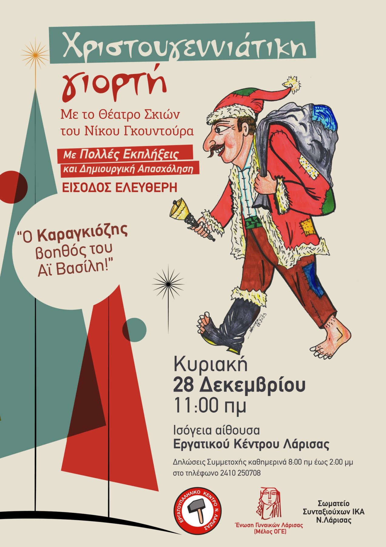 Το Εργατικό Κέντρο Λάρισας μαζί με Εργατικά Σωματεία, το Σωματείο Συνταξιούχων ΙΚΑ Ν.Λάρισας και την Ένωση Γυναικών Λάρισας (μέλος της ΟΓΕ), θα πραγματοποιήσουν για μία ακόμη χρονιά Χριστουγεννιάτικη γιορτή για τα παιδιά, την Κυριακή 28/12/2025, στις 11:00 το πρωί στην ισόγεια αίθουσα του Εργατικού Κέντρου «Τάκης Τσιόγκας». Το πρόγραμμα της εκδήλωσης θα περιλαμβάνει παράσταση θεάτρου σκιών με τίτλο «Ο καραγκιόζης βοηθός του άγιου βασίλη », έργο του Νίκου Γκουντούρα, ενώ συγχρόνως θα υπάρχουν και δραστηριότητες δημιουργικής απασχόλησης, πολλά δώρα κι άλλες εκπλήξεις για τους μικρούς μας φίλους . Η Χορωδία του σωματείου συνταξιούχων θα μας ταξιδέψει με κάλαντα από όλη την Ελλάδα.