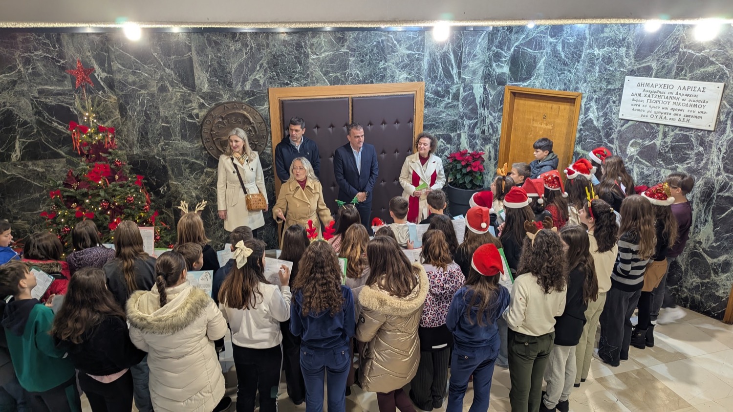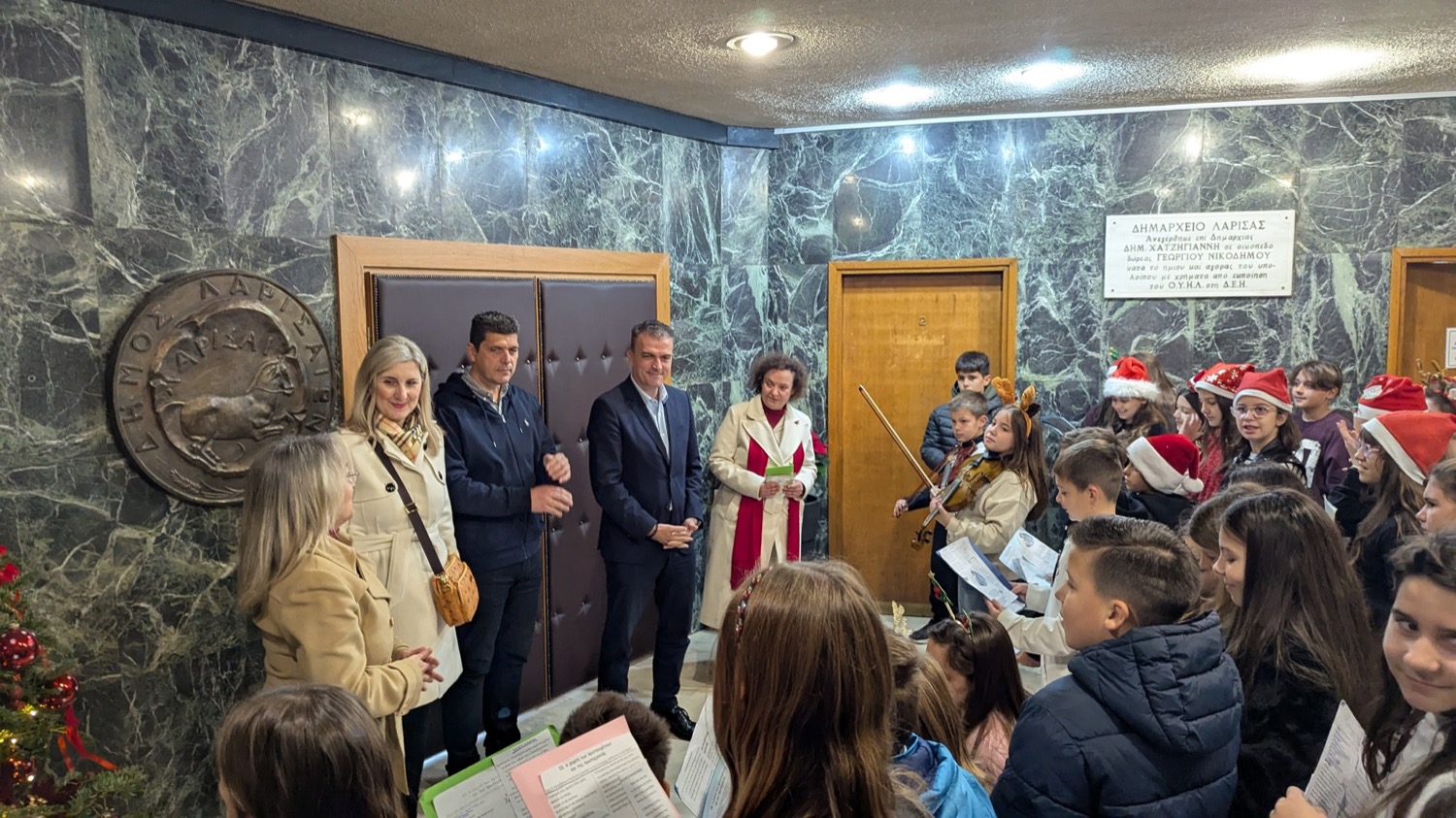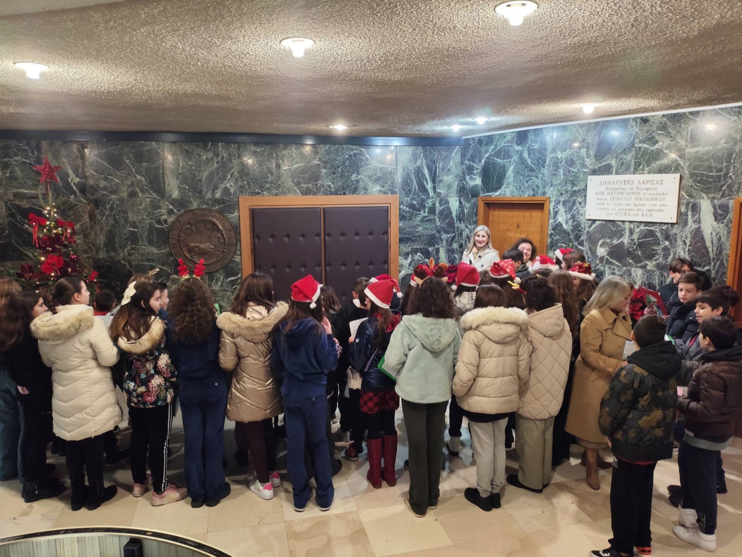 Τα παιδιά είχαν την τιμή να πουν τα κάλαντα στον Δήμαρχο Λαρισαίων κ. Αθανάσιο Μαμάκο, στην Αντιπεριφερειάρχη Θεσσαλίας κα Μαρία Γαλλιού και στη Διευθύντρια Πρωτοβάθμιας Εκπαίδευσης Λάρισας κα Αικατερίνη Καραγιώργου, οι οποίοι τα υποδέχτηκαν με ζεστασιά και συγκίνηση, τα συνεχάρησαν, τους πρόσφεραν κεράσματα και μοιράστηκαν μαζί τους ευχές για καλές γιορτές και ένα νέο έτος γεμάτο ελπίδα, χαρά και δημιουργικότητα.