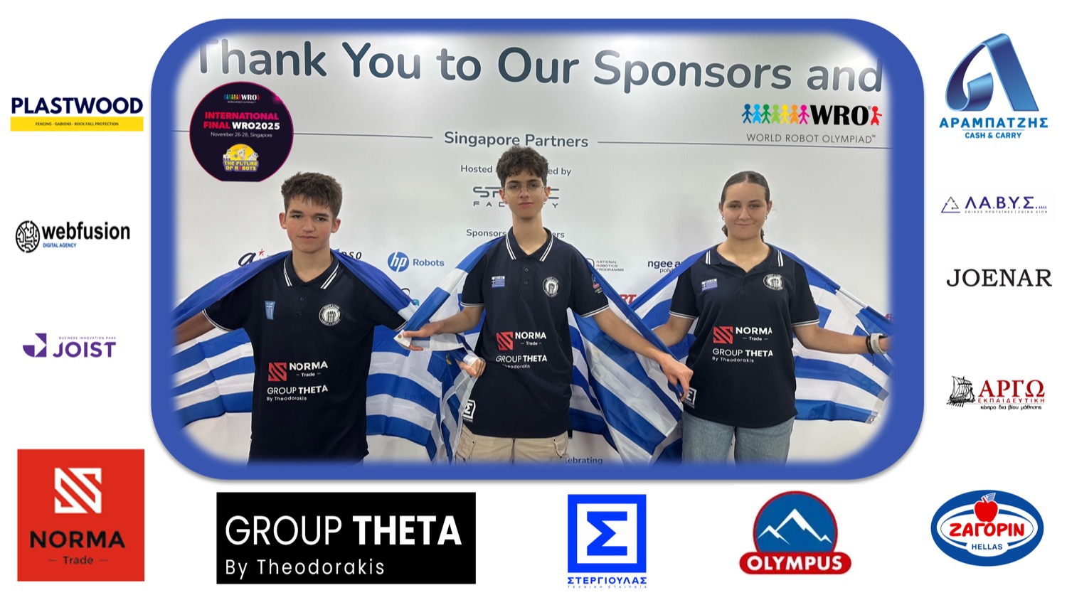 Οι γονείς της μαθητικής ομάδας ρομποτικής από τη Λάρισα ευχαριστούν όλους όσους στήριξαν τη συμμετοχή των παιδιών τους στην Παγκόσμια Ολυμπιάδα Ρομποτικής, η οποία πραγματοποιήθηκε στη Σιγκαπούρη από τις 26 έως τις 28 Νοεμβρίου, με τη συμμετοχή 120 ομάδων από όλο τον κόσμο.