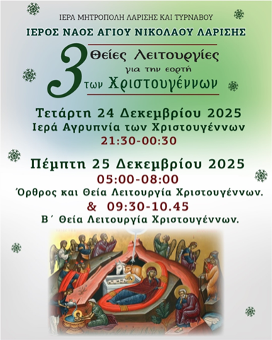 Από την Ιερά Μητρόπολη Λαρίσης και Τυρνάβου ανακοινώνονται οι ώρες για τις τρεις συνολικά Θείες Λειτουργίες την ημέρα των Χριστουγέννων που θα τελεστούν στον Ιερό Ναό του Αγίου Νικολάου, προκειμένου να διευκολυνθούν οι πιστοί Χριστιανοί.