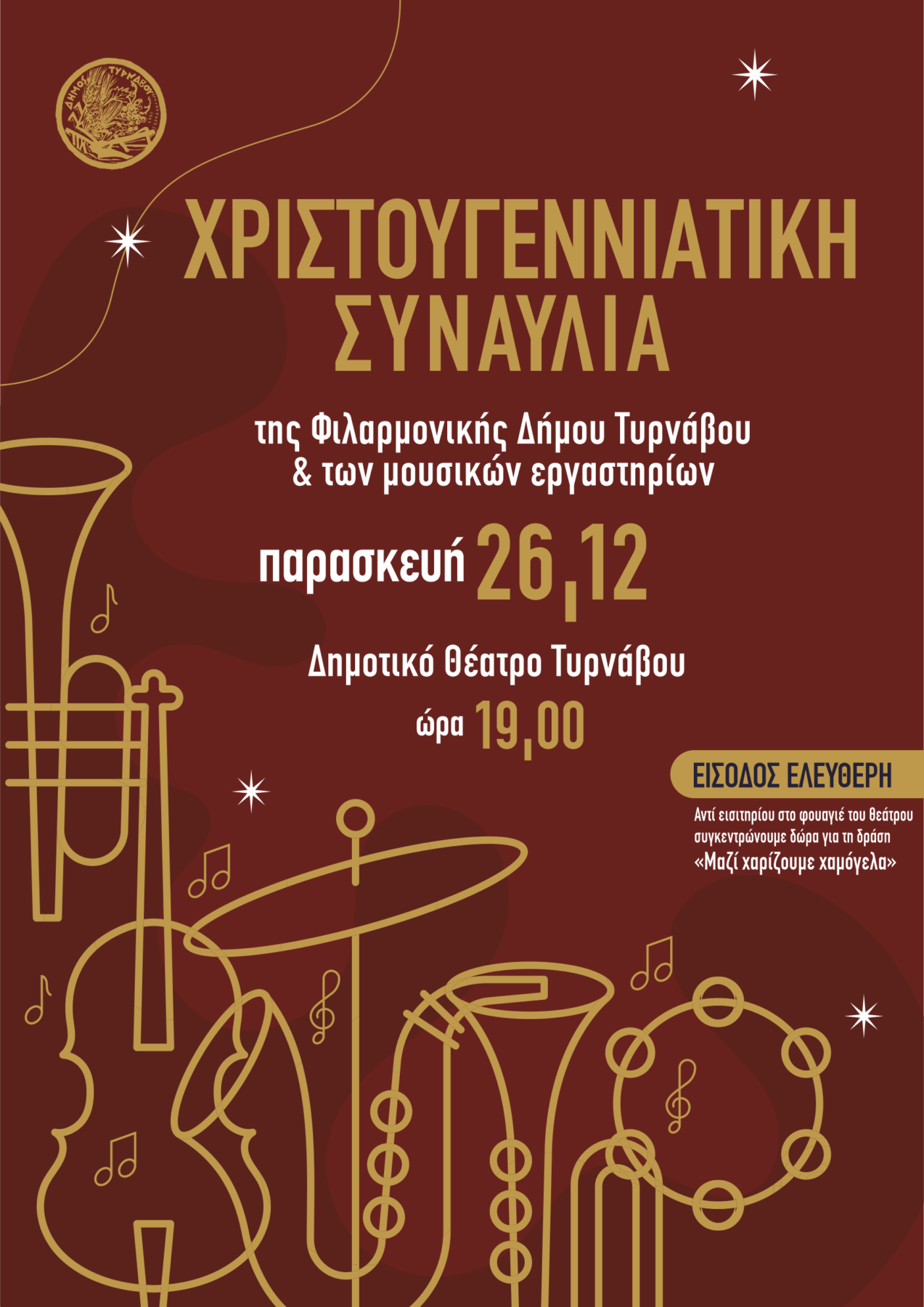 Χριστουγεννιάτικη συναυλία της Φιλαρμονικής Δήμου Τυρνάβου θα πραγματοποιηθεί την Παρασκευή 26 Δεκεμβρίου 2025 στις 7:00μμ στο Δημοτικό Θέατρο Τυρνάβου.