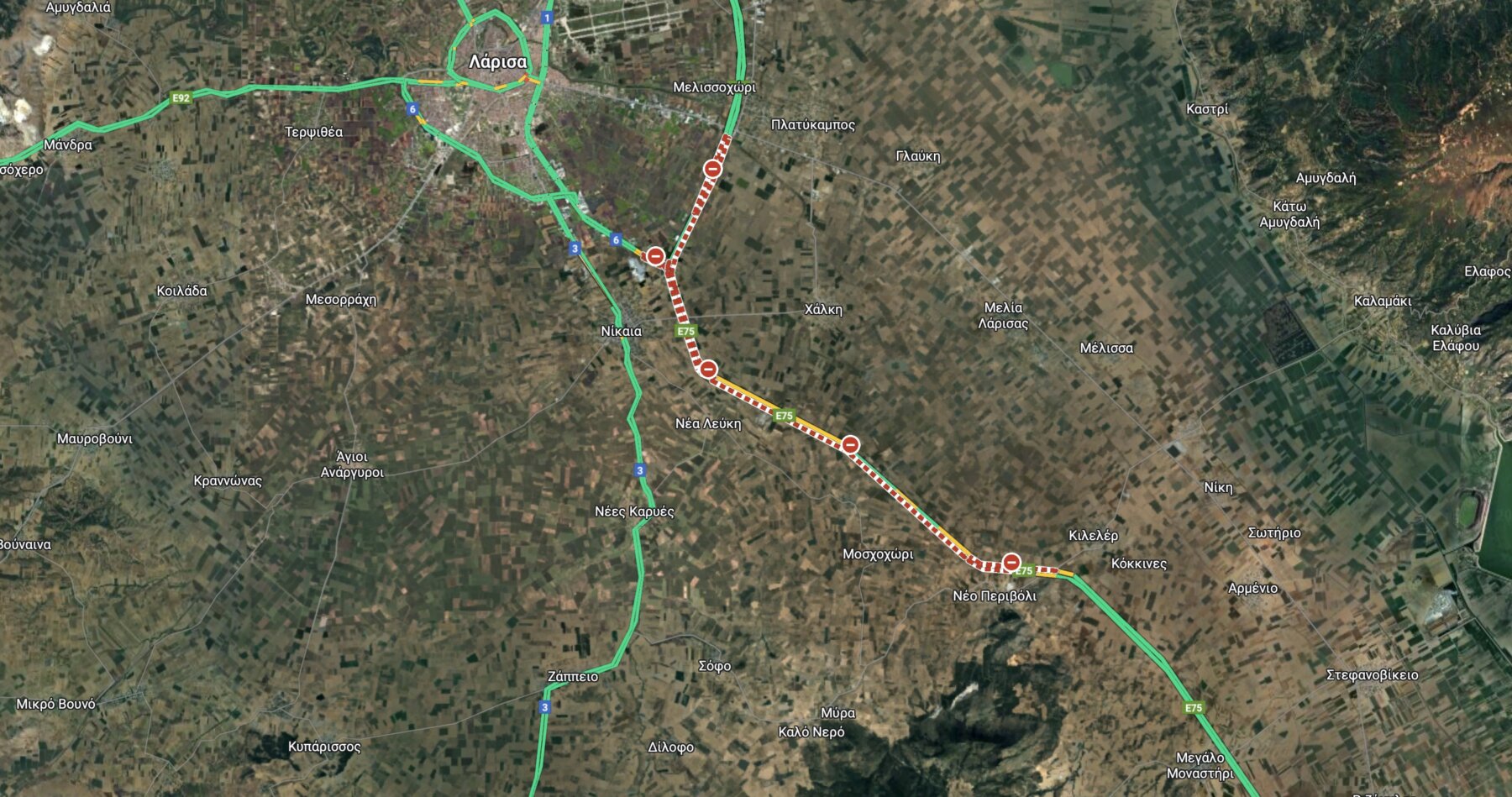 Δείτε τον χάρτη της google όπου με κόκκινο φαίνονται τα τμήματα του δρόμου όπου παρατηρείται επιβράδυνση στην περιοχή της Λάρισας: