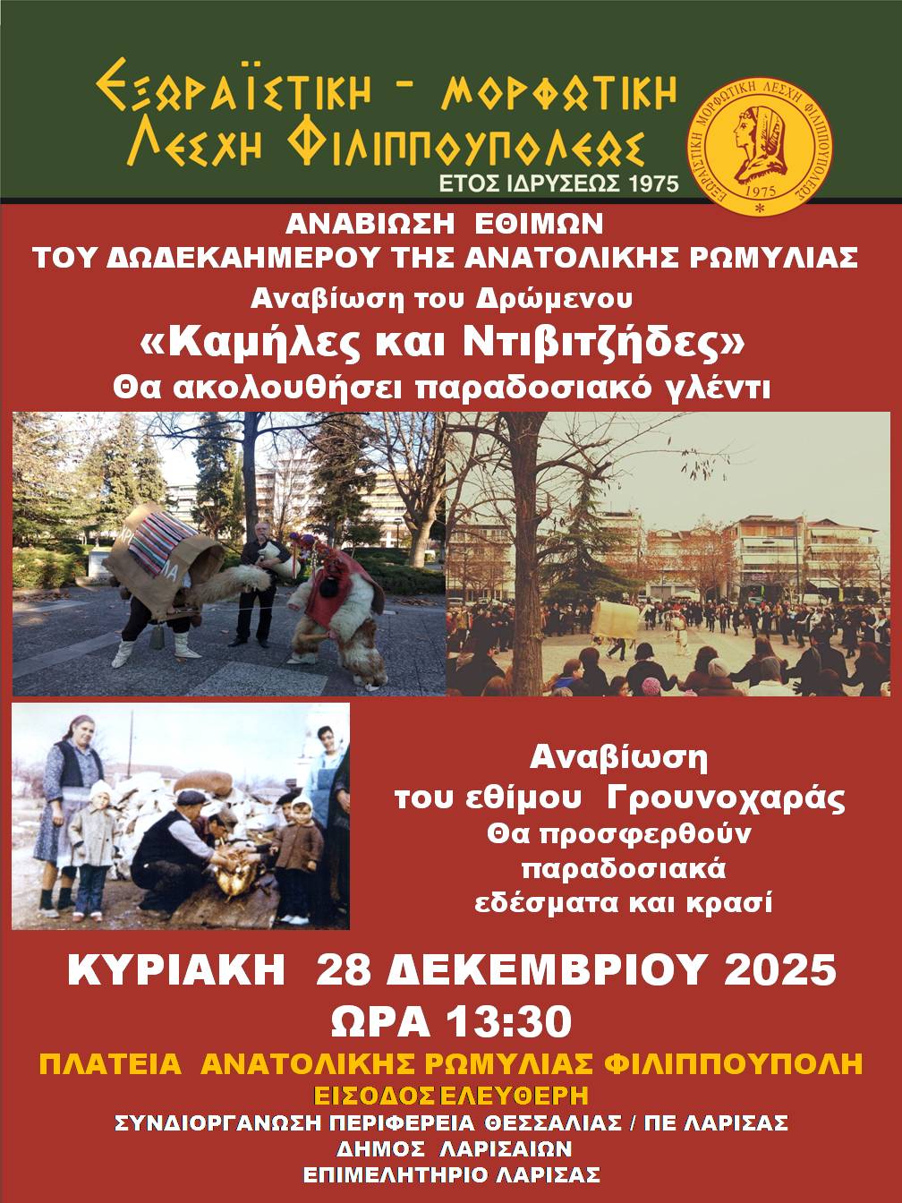 Την Κυριακή 28 Δεκεμβρίου η Λέσχη Φιλιππούπολης στην Πλατεία Φιλιππούπολης θα οργανώσει την εκδήλωση “Αναβίωση Εθίμων του Δωδεκαημέρου της Ανατολικής Ρωμυλίας ”