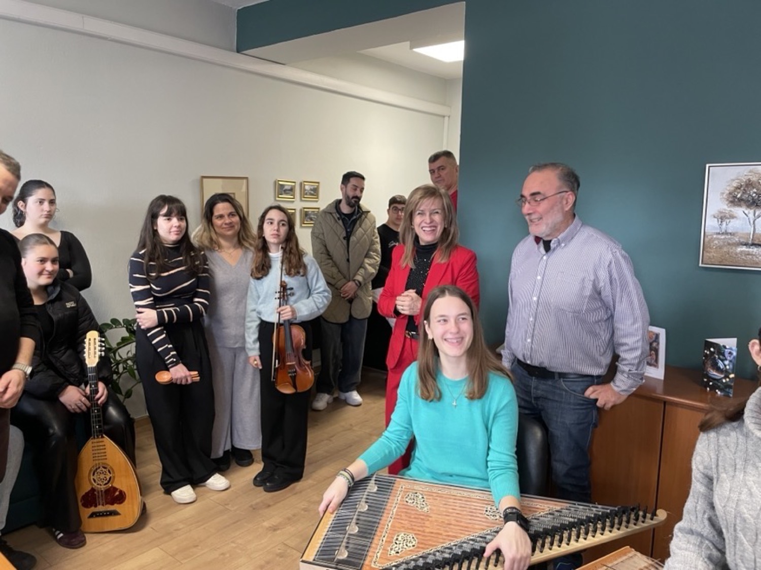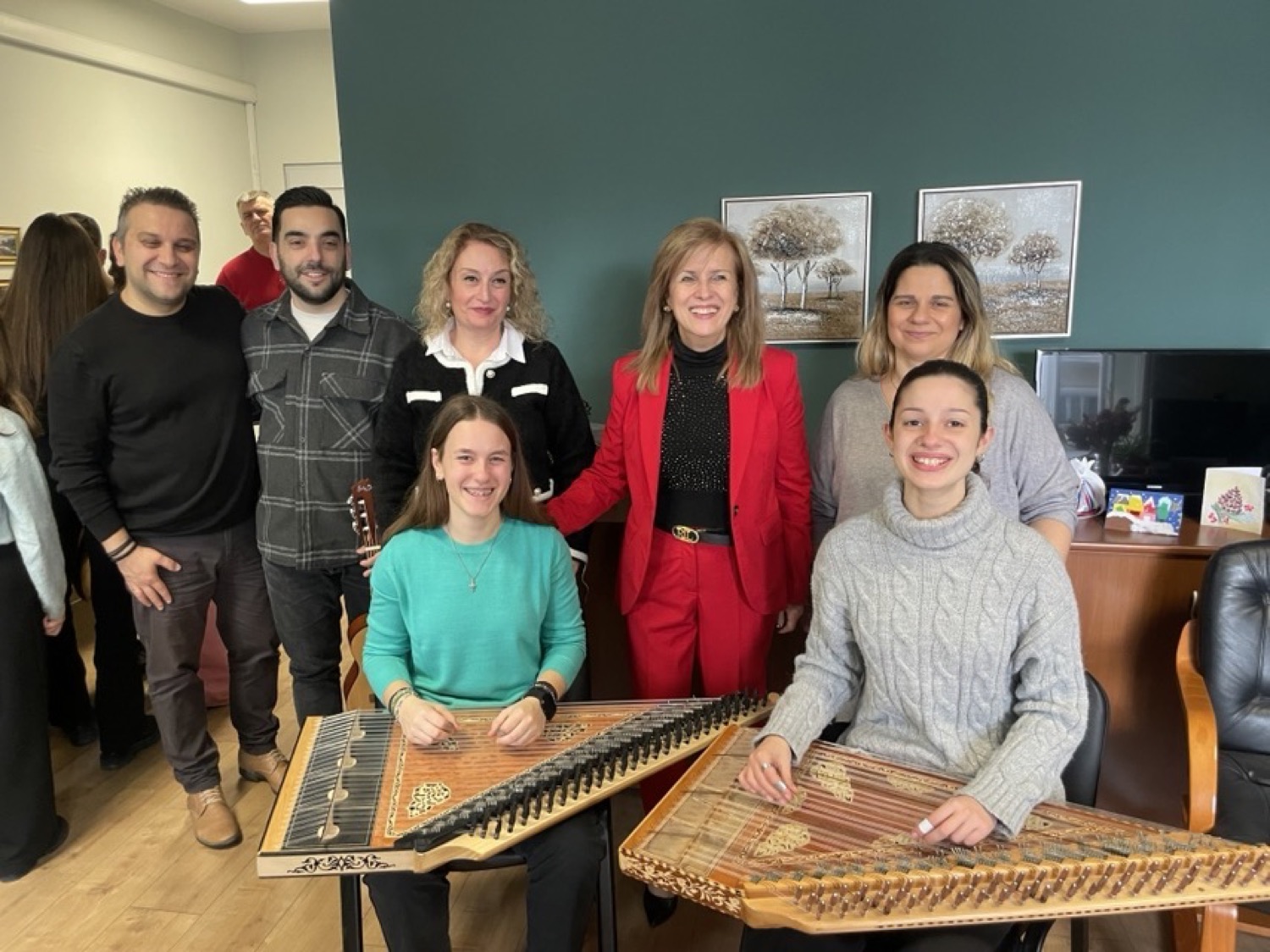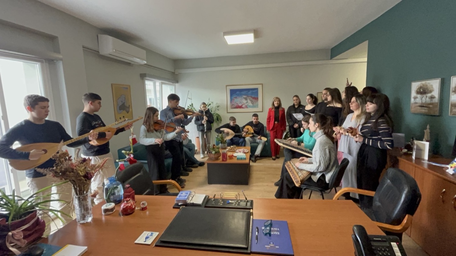 Τα παιδιά, συνόδευαν οι εκπαιδευτικοί Νάκου Μαρία, Δεδούσης Κωνσταντίνο και Καλόγηρος Σωτήρη με τα μουσικά τους όργανα πλημμυρίζοντας το γραφείο με γιορτινή διάθεση και το πνεύμα των ημερών.