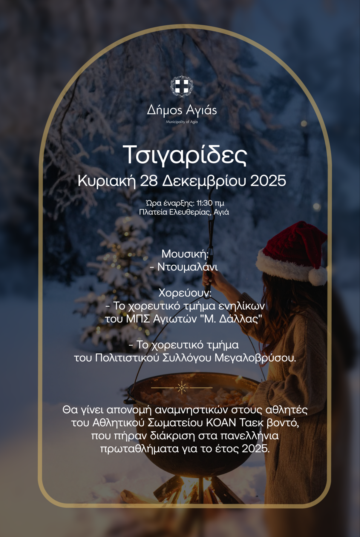Το παραδοσιακό έθιμο των «τσιγαρίδων» θα αναβιώσει για μια ακόμα φορά την Κυριακή 28 Δεκεμβρίου 2025 στην Πλατεία Ελευθερίας της Αγιάς στις 11:30πμ. Πρόκειται για μια γιορτή με την οποία αποχαιρετάμε τον χρόνο και τιμούμε τους ανθρώπους που διακρίθηκαν μέσα στο 2025.