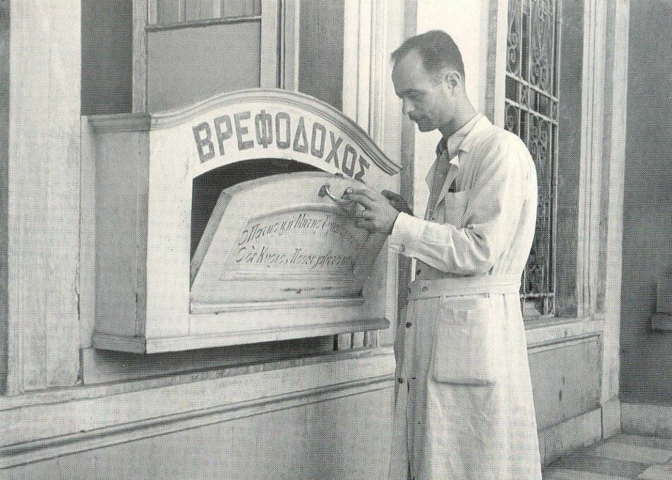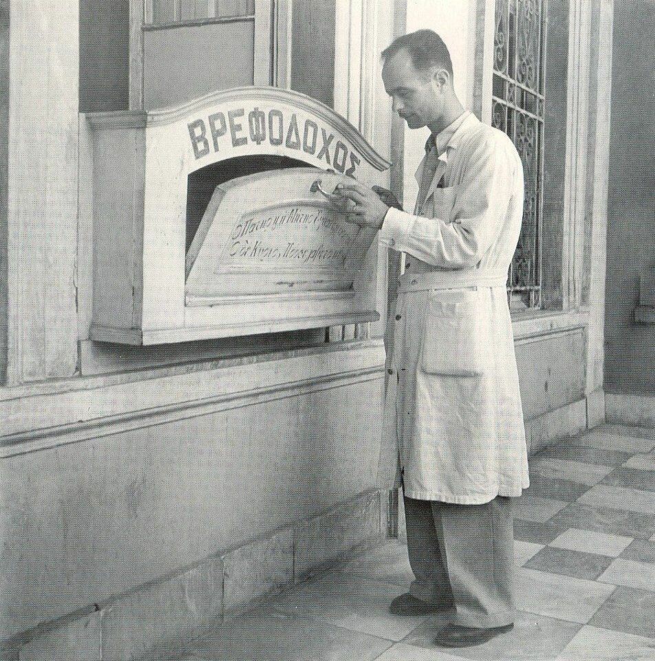 Αμέσως μου ήρθαν στο μυαλό κάποιες εκπληκτικές φωτογραφίες της Βούλας Παπαϊωάννου για λογαριασμό της UNRRA που κυκλοφόρησαν το 2020 σε ένα συλλεκτικό «Λεύκωμα Ζωής» από το κέντρο ερευνών «Ρίζες» και το Μουσείο Μπενάκη. Οι βρεφοδόχοι με είχαν συγκλονίσει. Σαν γραμματοκιβώτια για μωρά Με την επιγραφή «Ο Πατήρ και η Μήτηρ εγκατέλειψάν με, ο Κύριος προσελάβετό με»… Βρισκόταν στον εξωτερικό τοίχο βρεφοκομείων για να μπορούν να αφήνουν κρυφά τα «απορριπτόμενα» μωρά. Χωρούσαν δύο βρέφη. Όταν τοποθετούσαν το μωρό στο κιβώτιο, ένα ηλεκτρικό κουδούνι ανήγγειλε στο προσωπικό του βρεφοκομείου την «πράξιν της εγκαταλείψεως»!