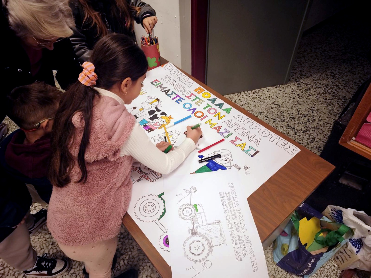 Παράλληλα για τις πιο μικρές ηλικίες των μικρών μας φίλων ήταν σε εξέλιξη παράλληλη δραστηριότητα όπου τα παιδιά ζωγράφιζαν εορταστικά μηνύματα για τους αγωνιστές εργάτες καθώς και για τους βιοπαλαιστές αγροτοκτηνοτρόφους που βρίσκονται στα μπλόκα. Σε μια περίοδο που ο λαός μας δοκιμάζεται από την ακρίβεια και την εργασιακή ανασφάλεια η γιορτή αυτή αποτέλεσε μια ανάσα με ένα ξεκάθαρο μήνυμα αλληλεγγύης.