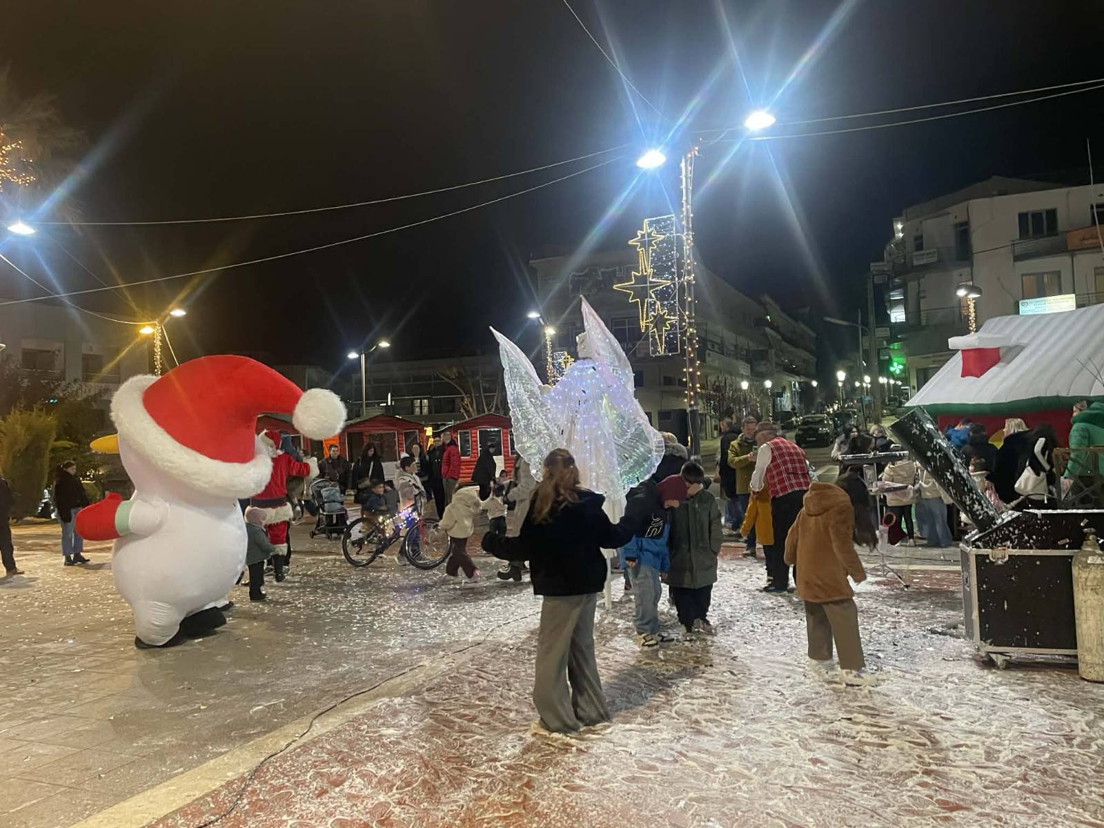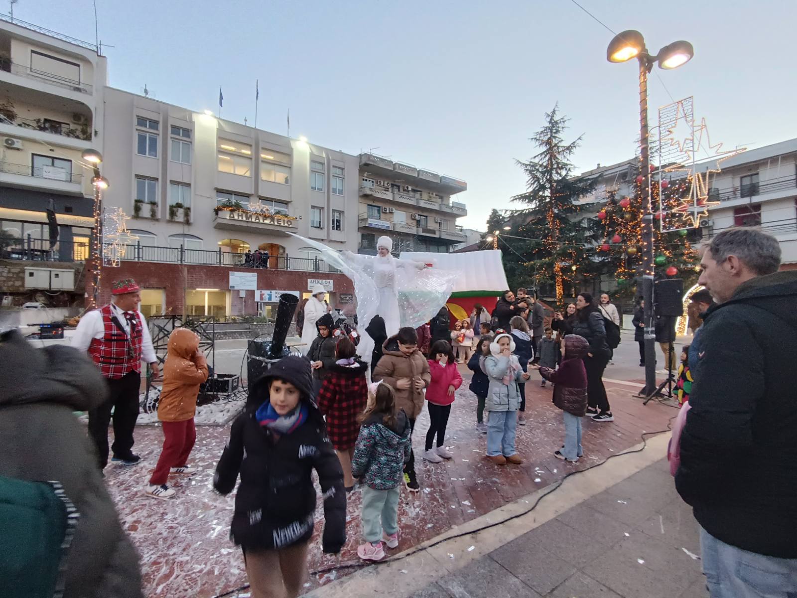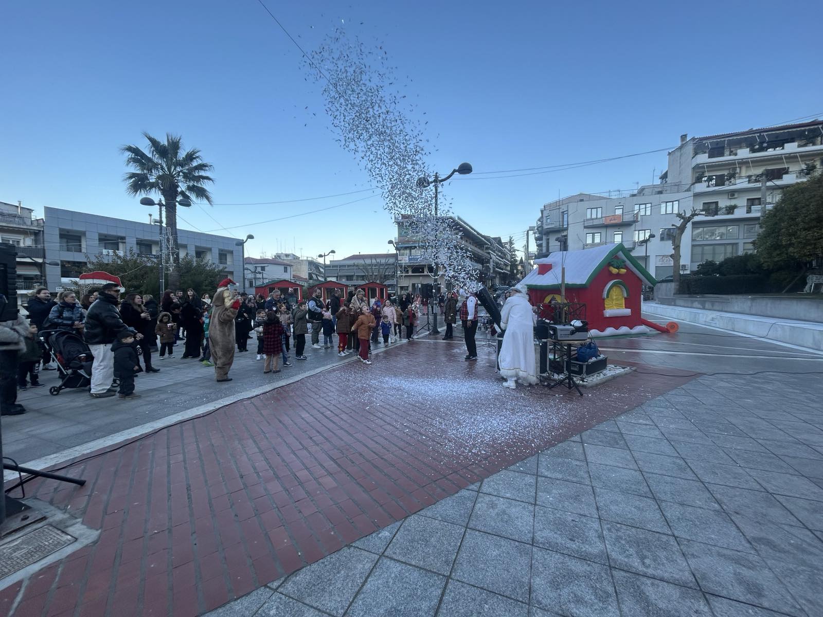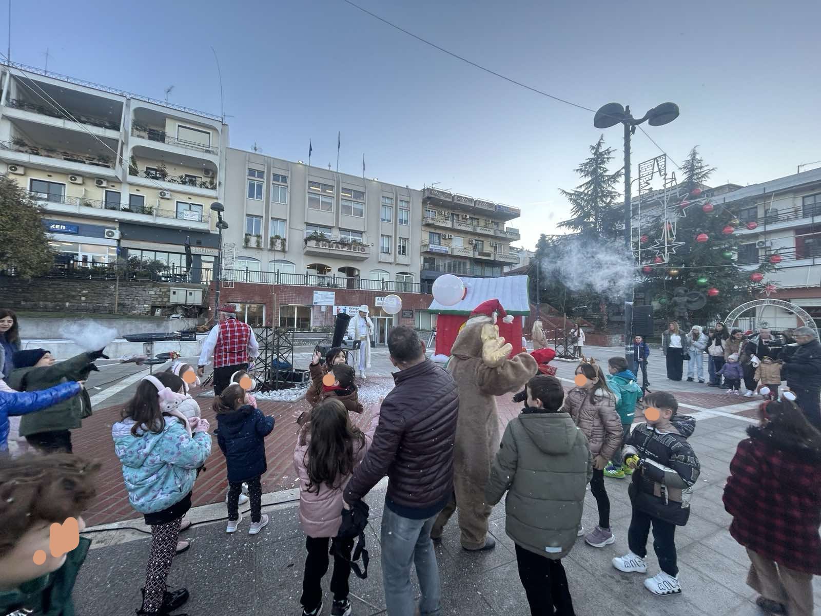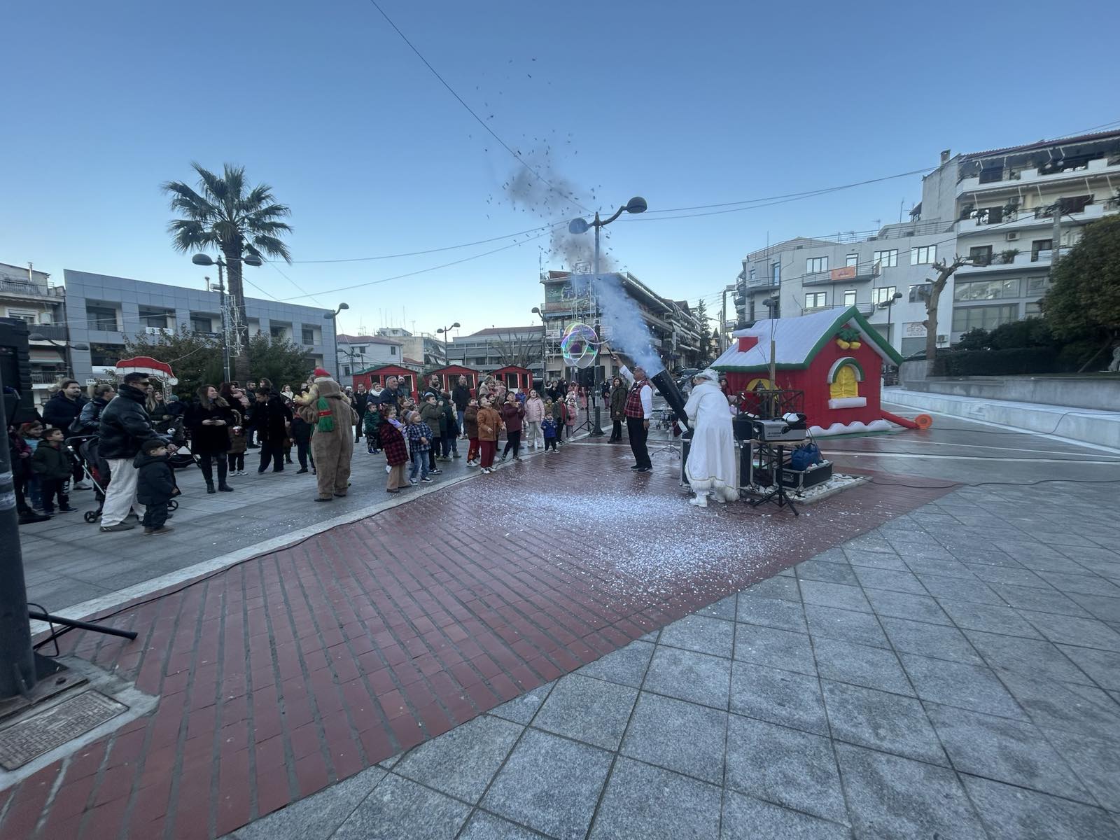 Από νωρίς, η πλατεία γέμισε παιδικές φωνές, χαμόγελα και οικογένειες που έσπευσαν να ζήσουν τη μαγεία των γιορτών. Φουσκωτά σπιτάκια, δημιουργικές παιδικές δράσεις και θεάματα δρόμου κράτησαν αμείωτο το ενδιαφέρον, μετατρέποντας το κέντρο της πόλης σε έναν ζωντανό, εορταστικό χώρο. Ιδιαίτερη εντύπωση προκάλεσε η μηχανή χιονιού, η οποία «έντυσε» την πλατεία στα λευκά, δημιουργώντας εικόνες βγαλμένες από χριστουγεννιάτικο παραμύθι και ενθουσιάζοντας μικρούς και μεγάλους.