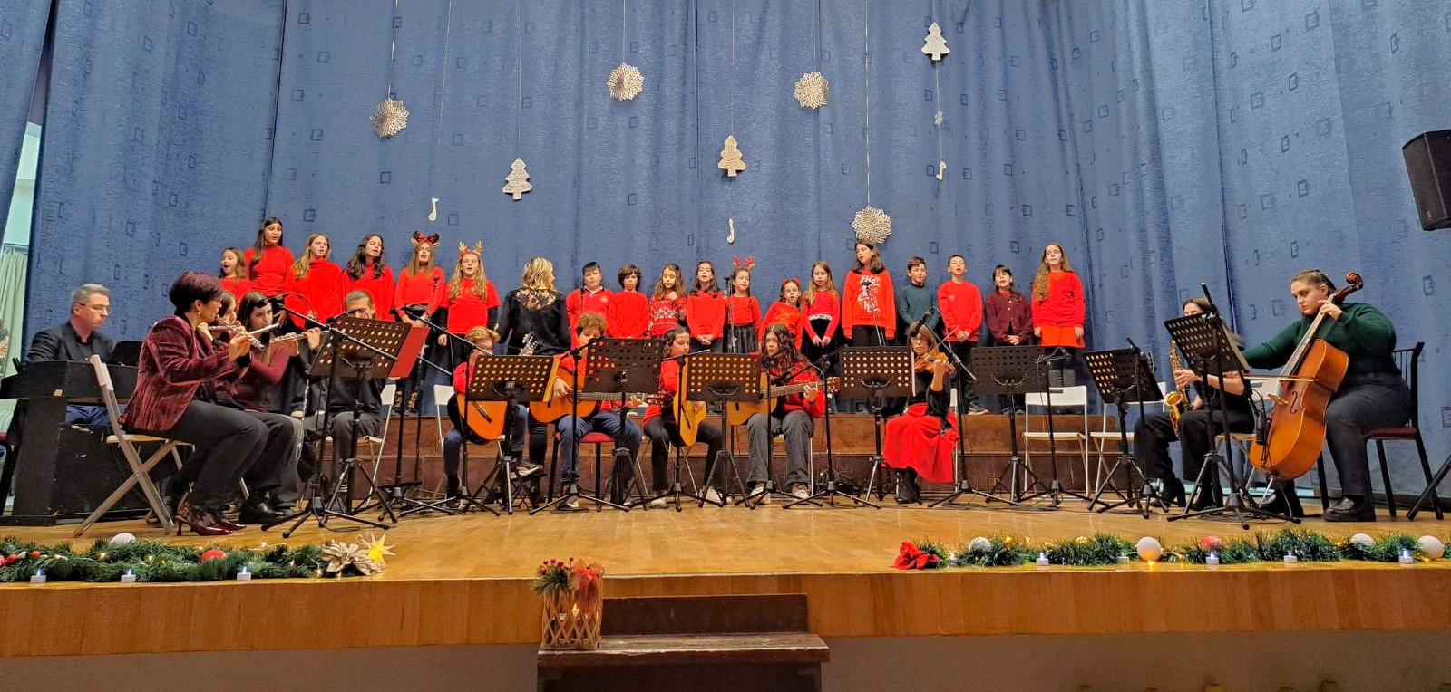 Οι μικροί μαθητές της μουσικής προπαίδειας και της προωδειακης παρουσίασαν ένα μουσικό δρώμενο βασισμένο στις μουσικοπαιδαγωγικές προσεγγίσεις του C.Orff με θέμα το παραμύθι του Καρυοθραύστη. Μεταλλόφωνα, κουδουνάκια και όμορφες μελωδίες του P.I.Tchaikovsky πλημμύρισαν την αίθουσα μέσα σε μια ατμόσφαιρα χαράς και ζεστασιάς. Στη συνέχεια τα ορχηστρικά σύνολα της μουσικής σχολής ερμήνευσαν υποδειγματικά χριστουγεννιάτικες και πρωτοχρονιάτικες μελωδίες μεταφέροντας σε όλους το πνεύμα των Χριστουγέννων ενώ η χορωδία της μουσικής σχολής τραγούδησε χριστουγεννιάτικα κάλαντα από διάφορες περιοχές της Ελλάδας δίνοντας μηνύματα ευτυχίας και ελπίδας σε όλο τον κόσμο.