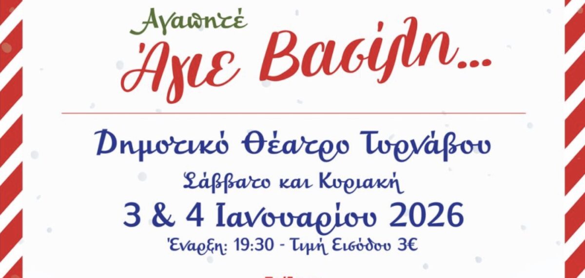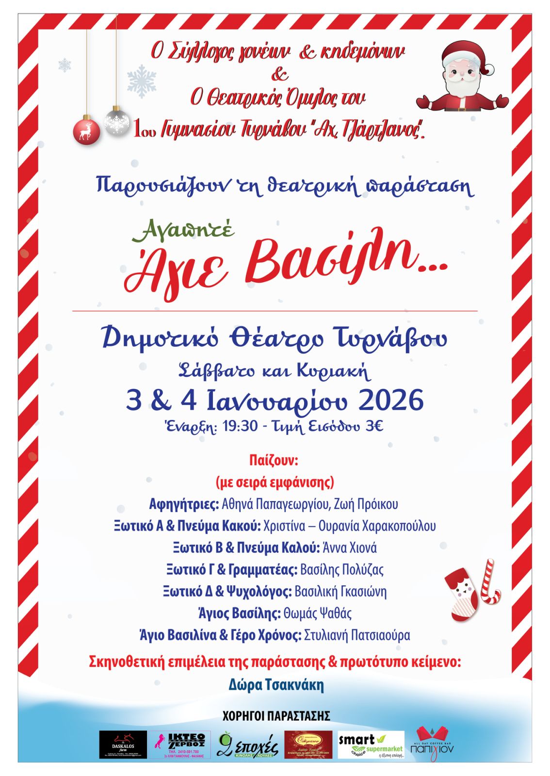 Ο Σύλλογος Γονέων και Κηδεμόνων και ο Θεατρικός Όμιλος του 1ου Γυμνασίου Τυρνάβου «Αχ. Τζάρτζανος», διοργανώνουν την πρώτη θεατρική παράσταση της χρονιάς: «Αγαπητέ Άγιε Βασίλη…».