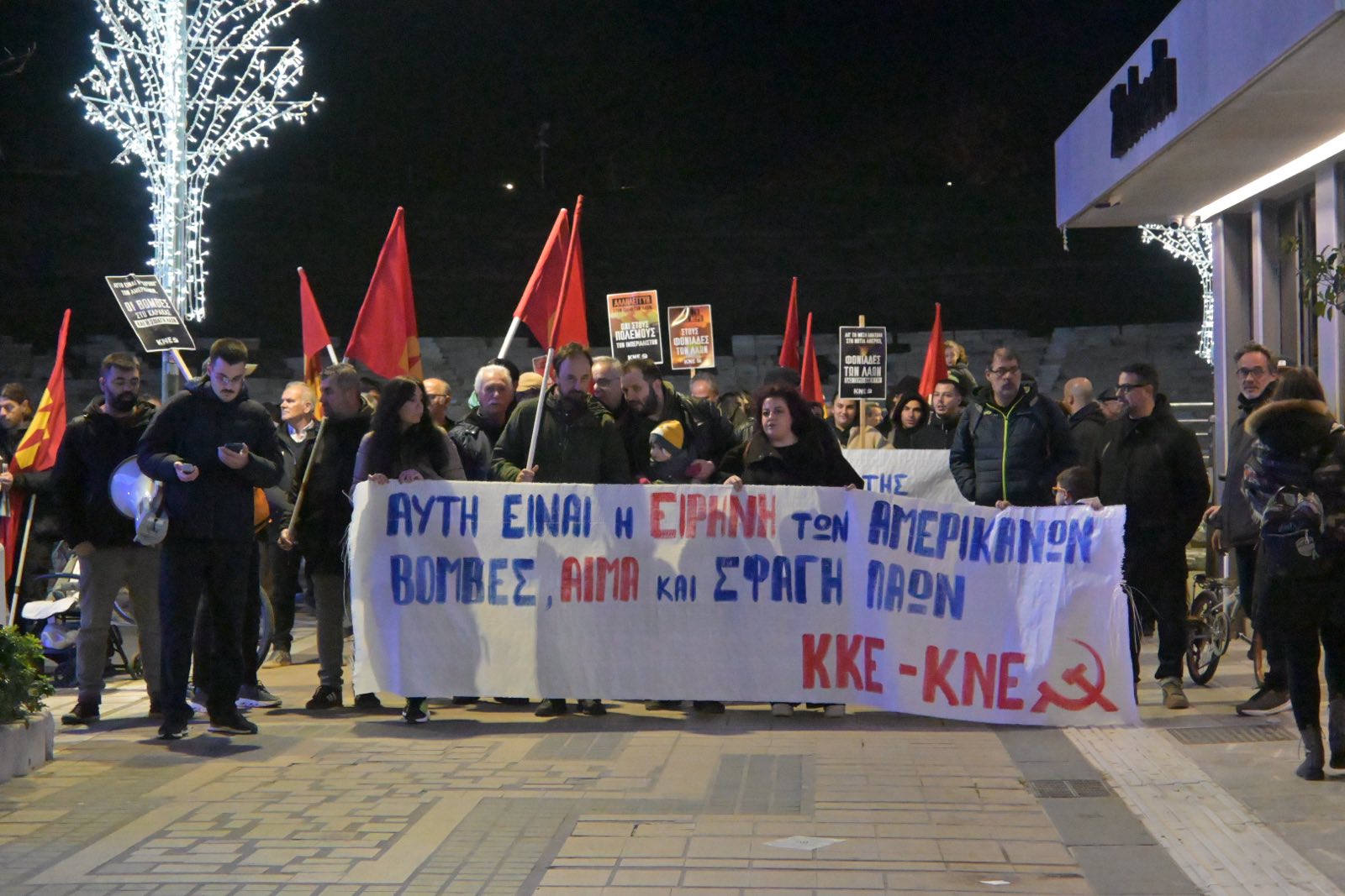 Ο αντιπρόεδρος του Εργατικού Κέντρου Λάρισας Αχιλλέας Σίμος, στην ομιλία του τόνισε μεταξύ άλλων: «Το ΚΚΕ απορρίπτει τα σαθρά προσχήματα της κυβέρνησης των ΗΠΑ που επικαλείται την καταπολέμηση εμπορίας ναρκωτικών για να δικαιολογήσει το νέο της έγκλημα».