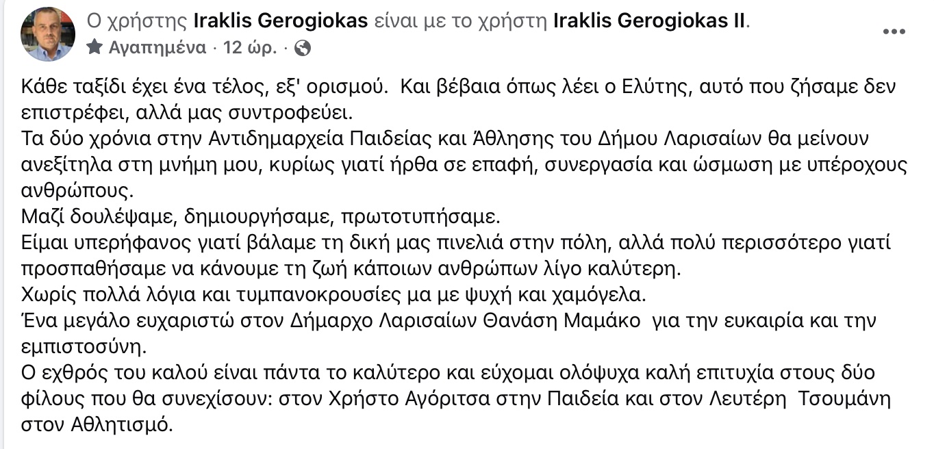 Σπάνια μια αποχαιρετιστήρια ανάρτηση διαβάζεται χωρίς «δεύτερες σκέψεις». Στην περίπτωση του μέχρι πρότινος αντιδημάρχου Ηρακλή Γερογιώκα, όμως, το κλίμα είναι καθαρό. Μιλά για το τέλος ενός ταξιδιού, για όσα δεν επιστρέφουν αλλά μένουν, για δύο χρόνια δουλειάς με ανθρώπους, συνεργασίες, δημιουργία και μια προσπάθεια να γίνει η καθημερινότητα κάποιων λίγο καλύτερη.