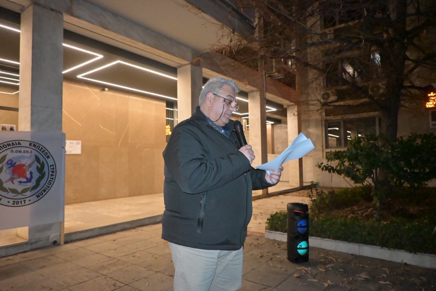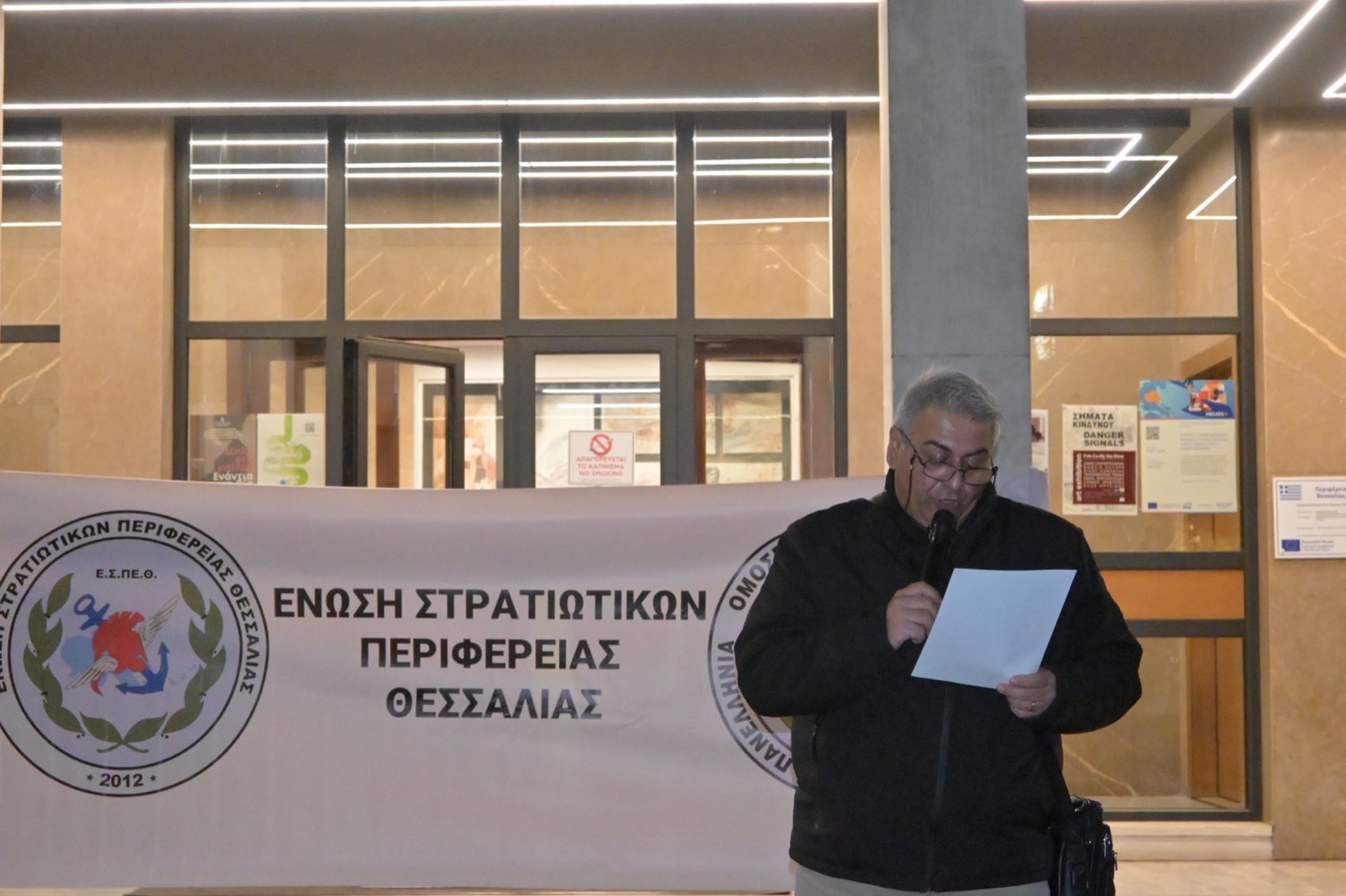 Συγκέντρωση διαμαρτυρίας για το πολυνομοσχέδιο του ΥΠΕΘΑ, το οποίο κατατέθηκε στην ολομέλεια της Βουλής για ψήφιση από την Ένωση Στρατιωτικών Περιφέρειας Θεσσαλίας, έλαβε χώρα στη Λάρισα με τη συμμετοχή εκπροσώπων του κλάδου.