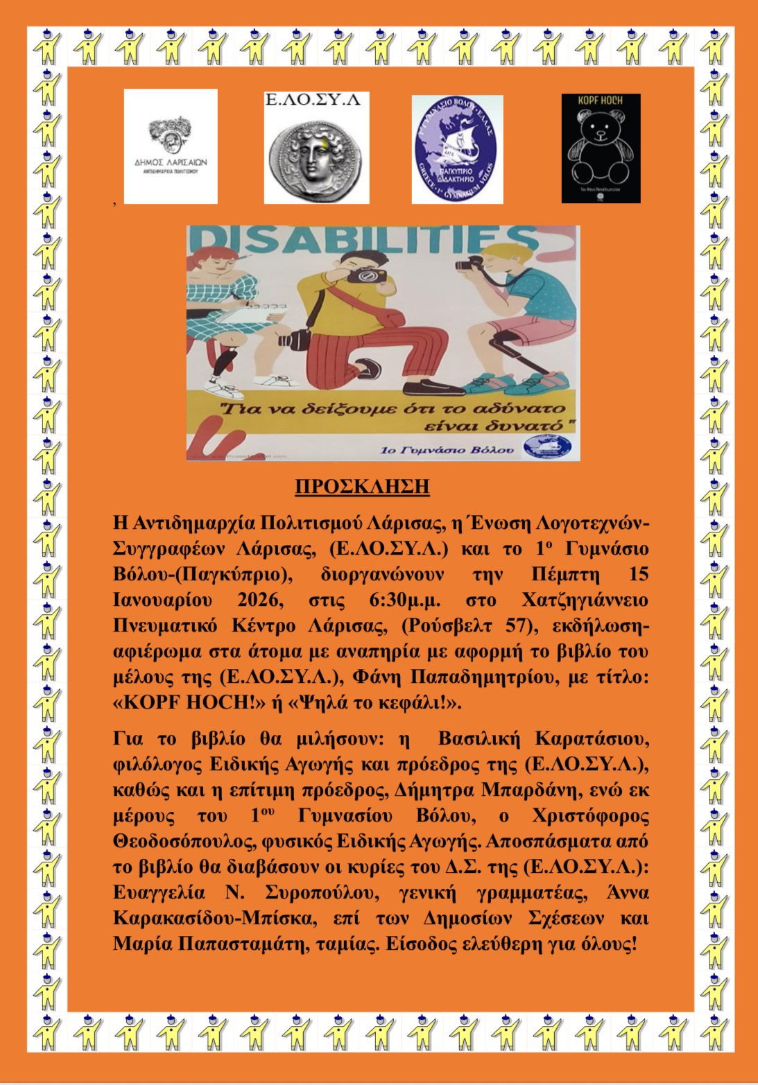 Η Αντιδημαρχία Πολιτισμού Λάρισας, η Ένωση Λογοτεχνών – Συγγραφέων Λάρισας (Ε.ΛΟ.ΣΥ.Λ.) και το 1ο Γυμνάσιο Βόλου (Παγκύπριο) διοργανώνουν εκδήλωση–αφιέρωμα στα άτομα με αναπηρία, με αφορμή το βιβλίο του συγγραφέα και μέλους της Ε.ΛΟ.ΣΥ.Λ., Φάνη Παπαδημητρίου, με τίτλο «KOPF HOCH!» – «Ψηλά το κεφάλι».