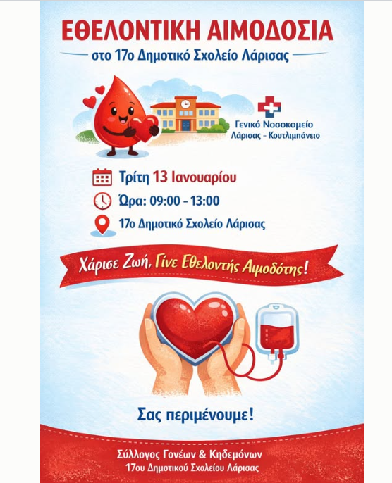 Το 17ο Δημοτικό Σχολείο και ο Σύλλογος Γονέων και Κηδεμόνων καλεί εκπαιδευτικούς, γονείς και κηδεμόνες , τους κατοίκους της περιοχής και όσους/ες θέλουν να συμμετάσχουν στην εθελοντική αιμοδοσία να προσέλθουν στο χώρο του 17ου Δημοτικού Σχολείου , Μαγριέ 1, Ανθούπολη από 9:00 ως 13:00 την Τρίτη 13-12-2026.