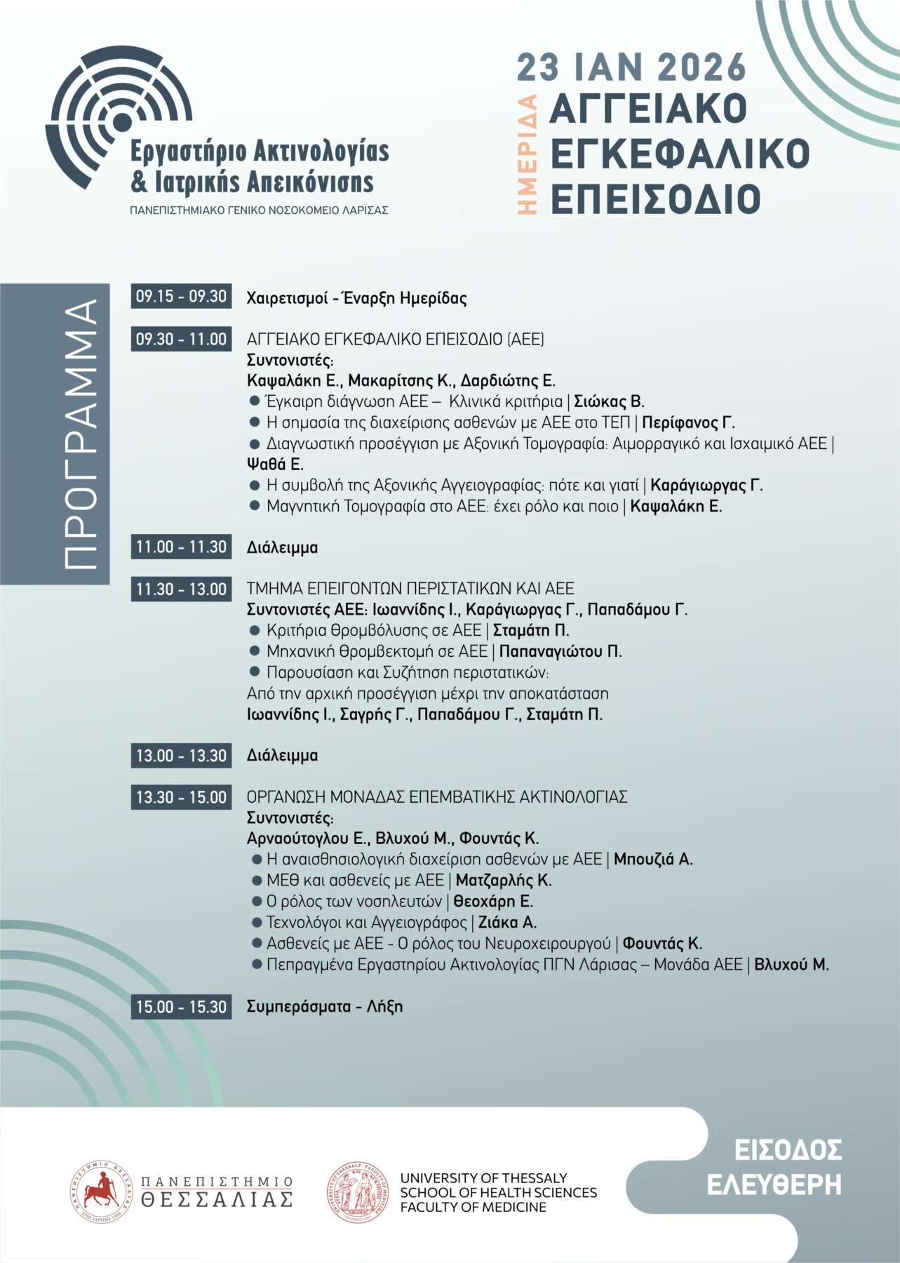 Hμερίδα με θέμα το αγγειακό εγκεφαλικό επεισόδιο διοργανώνεται από το Πανεπιστημιακό Nοσοκομείο Λάρισας την Παρασκευή 23 Ιανουαρίου στην Ιατρική Σχολή του Πανεπιστημίου Θεσσαλίας.