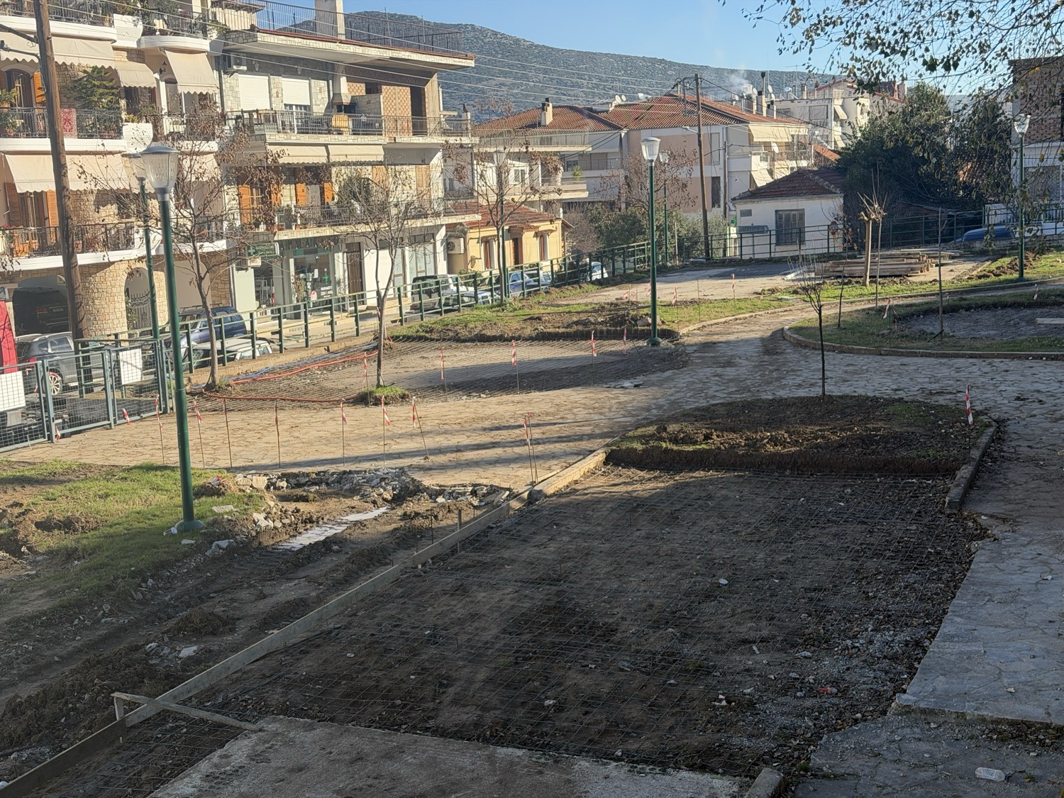 Ήδη έχουν ολοκληρωθεί οι αποξηλώσεις των παλαιών οργάνων παιδικής χαράς και του αστικού εξοπλισμού, με πρόβλεψη ώστε μέρος αυτών να επανατοποθετηθεί. Παράλληλα, απομακρύνονται υφιστάμενα κιγκλιδώματα για τη δημιουργία νέας εισόδου στη νοτιοανατολική πλευρά, η οποία θα συνδυάζεται με ράμπα πρόσβασης ΑμεΑ.