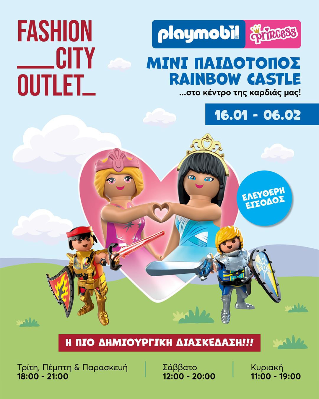 Από 16 Ιανουαρίου έως και 6 Φεβρουαρίου, ο Μίκυ και ο Γουίνι, Ιππότες και Πριγκίπισσες, και ολόκληρο το Κάστρο του Ουράνιου Τόξου προσκαλούν τους μικρούς μας φίλους σε έναν κόσμο γεμάτο χρώματα, ρόλους και ιστορίες. Μέσα από το παιχνίδι, τα παιδιά αναπτύσσουν τη φαντασία, τη λεπτή κινητικότητα και τη γνωστική τους κατανόηση, σε ένα περιβάλλον ασφαλές, χαρούμενο και απόλυτα σχεδιασμένο για τις ηλικίες τους.