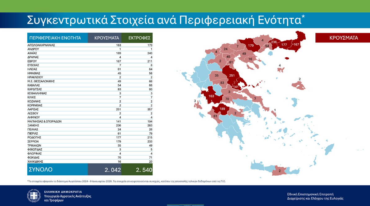 Για την περίοδο αναφοράς 20 Δεκεμβρίου 2025 – 9 Ιανουαρίου 2026 καταγράφηκαν 57 νέα κρούσματα σε 16 περιοχές, βάσει των αποτελεσμάτων των εργαστηριακών ελέγχων. Πρόκειται για τις Π.Ε. Αιτωλοακαρνανίας (7), Αχαΐας (6), Δράμας (1), Ηλείας (3), Ημαθίας (1), Καβάλας (2), Καρδίτσας (3), Κιλκίς (2), Λάρισας (2), Μαγνησίας & Σποράδων (3), Ξάνθης (9), Πέλλας (4), Πιερίας (6), Ροδόπης (5), Σερρών (1) και τη Μ.Ε. Θεσσαλονίκης (2).