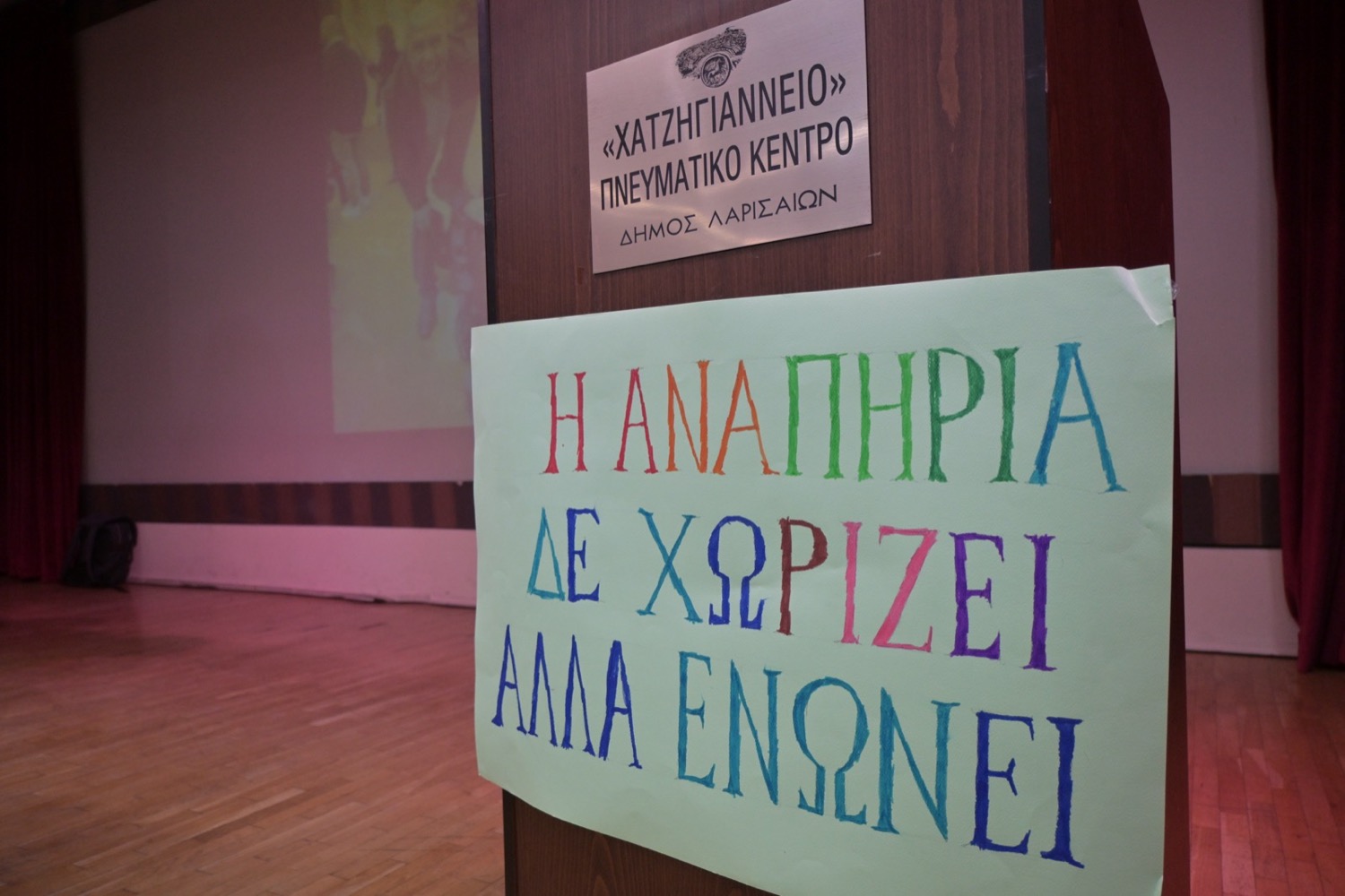 Εκδήλωση – αφιέρωμα στα άτομα με αναπηρία διοργάνωσε Αντιδημαρχία Πολιτισμού Λάρισας, η Ένωση Λογοτεχνών – Συγγραφέων Λάρισας και το 1ο Γυμνάσιο Βόλου (Παγκύπριο), με αφορμή το βιβλίο του Φάνη Παπαδημητρίου «KOPF HOCH!» – «Ψηλά το κεφάλι», στο Χατζηγιάννειο Πνευματικό Κέντρο Λάρισας.