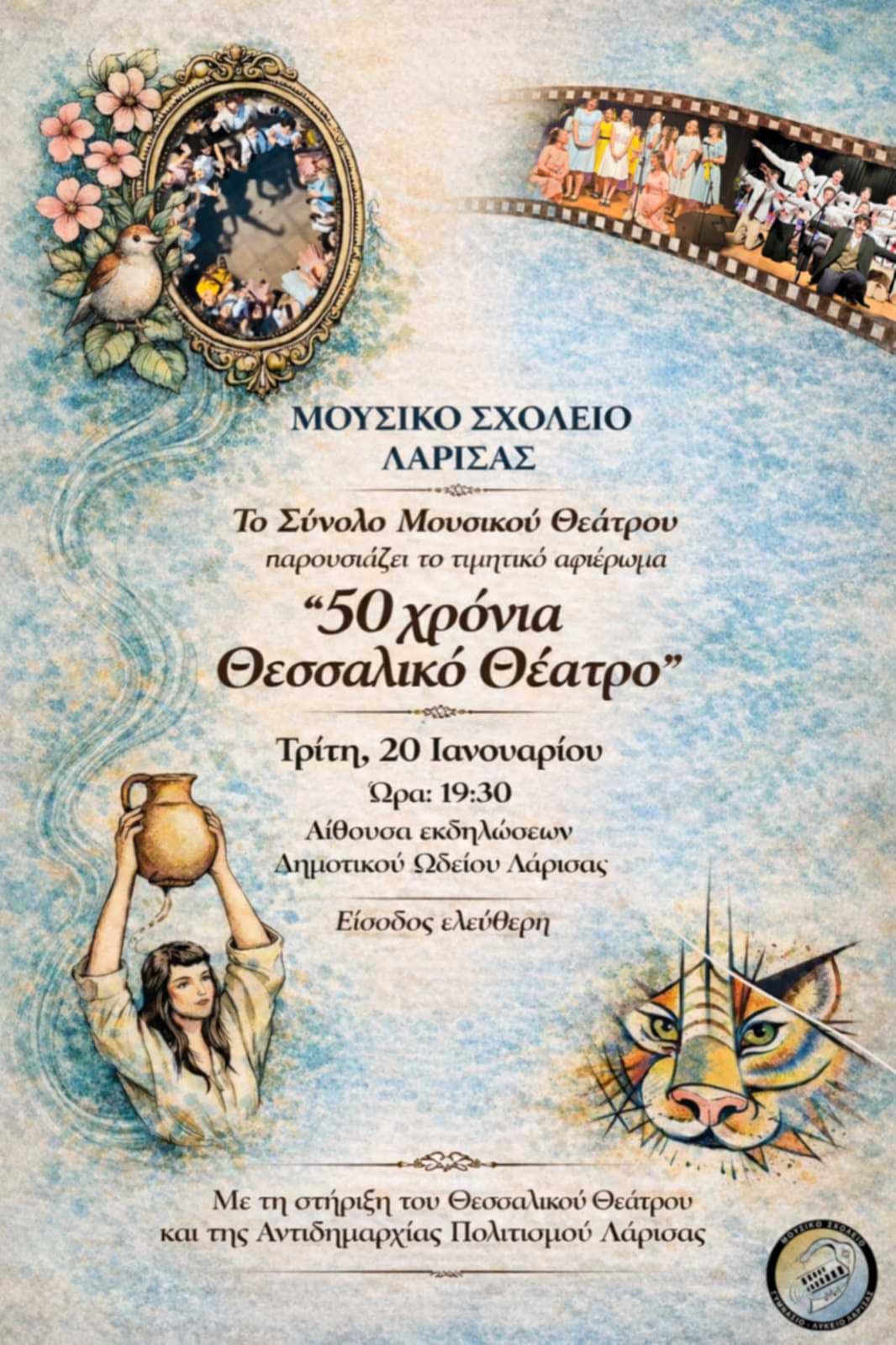 Με ένα ιδιαίτερο τιμητικό αφιέρωμα, το Σύνολο Μουσικού Θεάτρου του Μουσικού Σχολείου Λάρισας δίνει το παρόν στα πολιτιστικά δρώμενα της πόλης μας, παρουσιάζοντας το μωσαϊκό μουσικοθεατρικών παραστάσεων «50 χρόνια Θεσσαλικό Θέατρο» την Τρίτη 20 Ιανουαρίου και ώρα 19:30, στην Αίθουσα εκδηλώσεων του Δημοτικού Ωδείου Λάρισας.