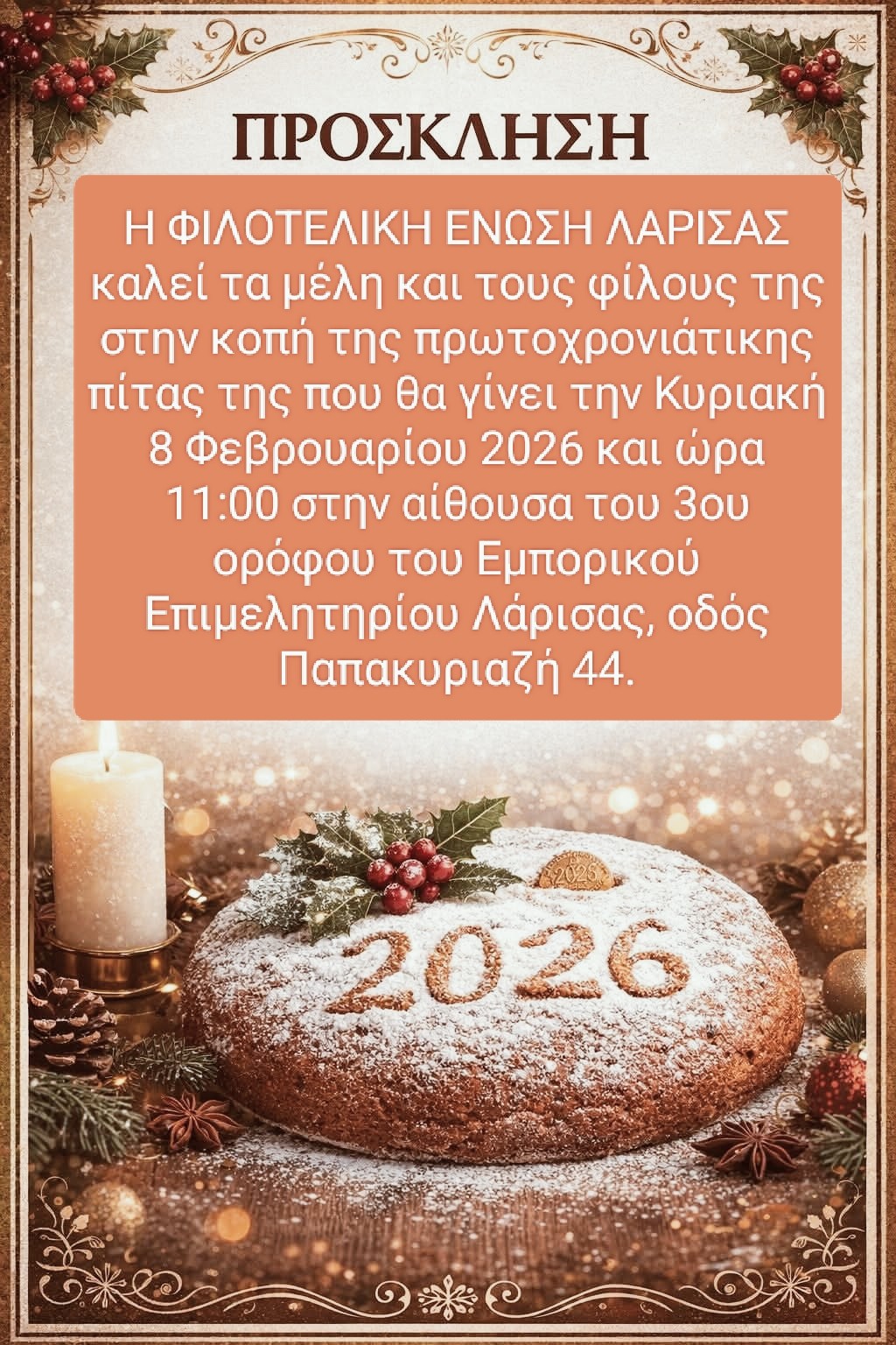 Την Κυριακή 08 Φεβρουαρίου 2026 και ώρα 11 το πρωί, η Φιλοτελική Ένωση Λαρισας θα κόψει την πρωτοχρονιάτικη πίτα της, σε εκδήλωση που θα λάβει χώρα στην Αίθουσα του 3ου ορόφου του Εμπορικού Επιμελητηρίου Λάρισας οδός Παπακυριαζή 44.