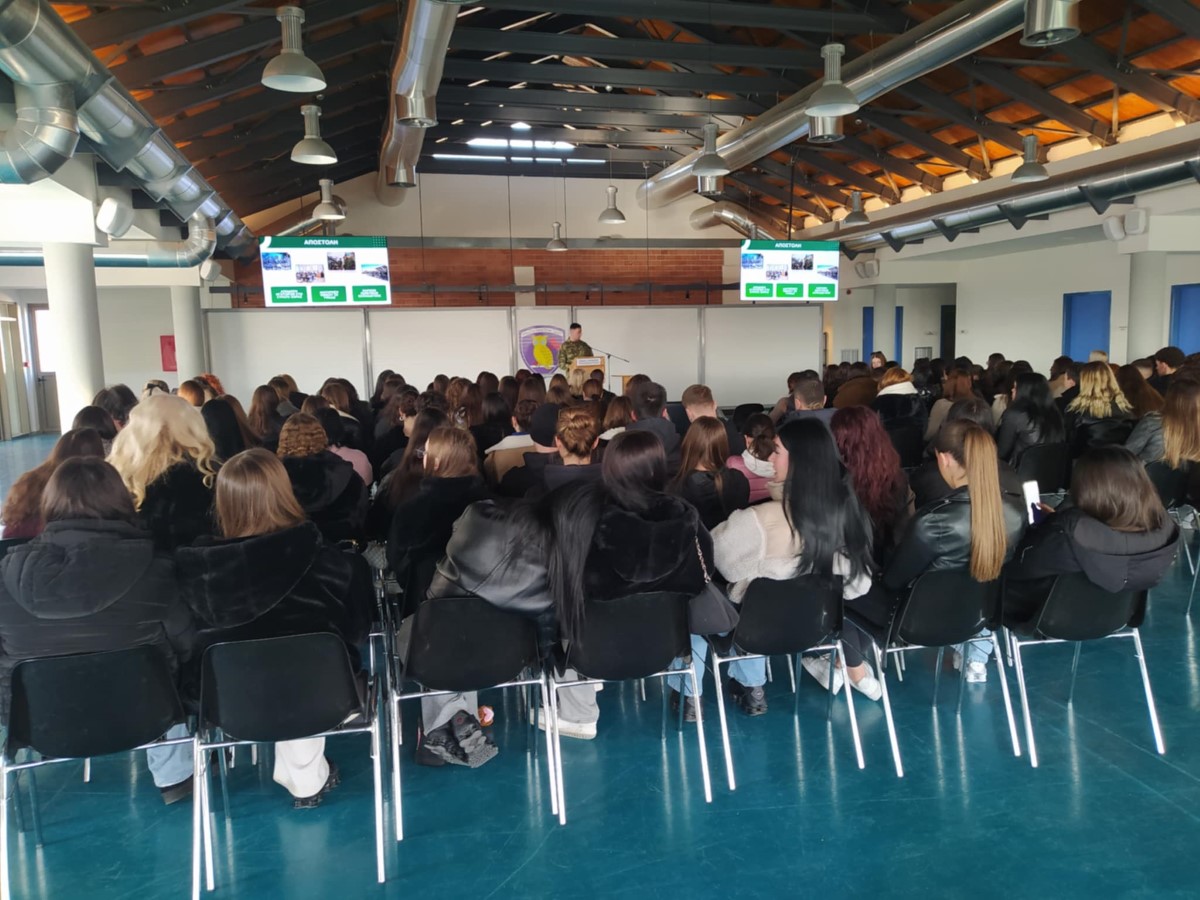 Η επίσκεψη ξεκίνησε με τη ΣΜΥ, όπου οι μαθητές ενημερώθηκαν για το έργο, την οργάνωση και την αποστολή της Σχολής, καθώς και για τις προοπτικές σταδιοδρομίας των αποφοίτων της. Μέσα από μια ξενάγηση στους χώρους της Σχολής, είχαν την ευκαιρία να γνωρίσουν τις συνθήκες εκπαίδευσης και πειθαρχίας που απαιτεί η στρατιωτική ζωή. Ο διοικητής της Σχολής Μονίμων Υπαξιωματικών μας πρόσφερε ένα μετάλλιο ως τιμή για την πολυετή αγαστή συνεργασία μας.
