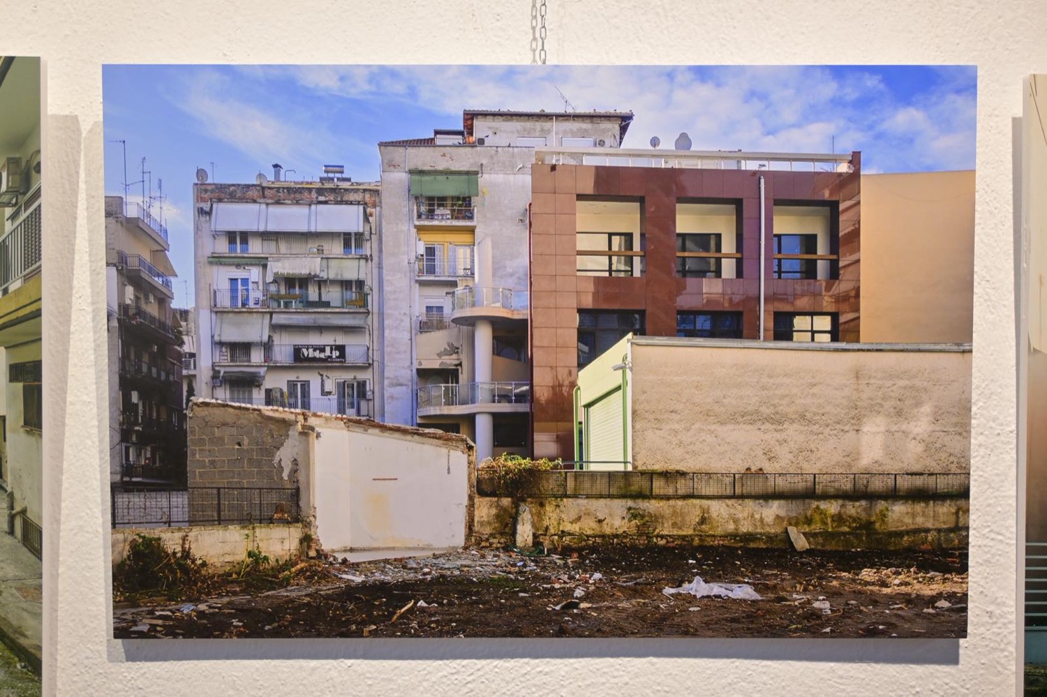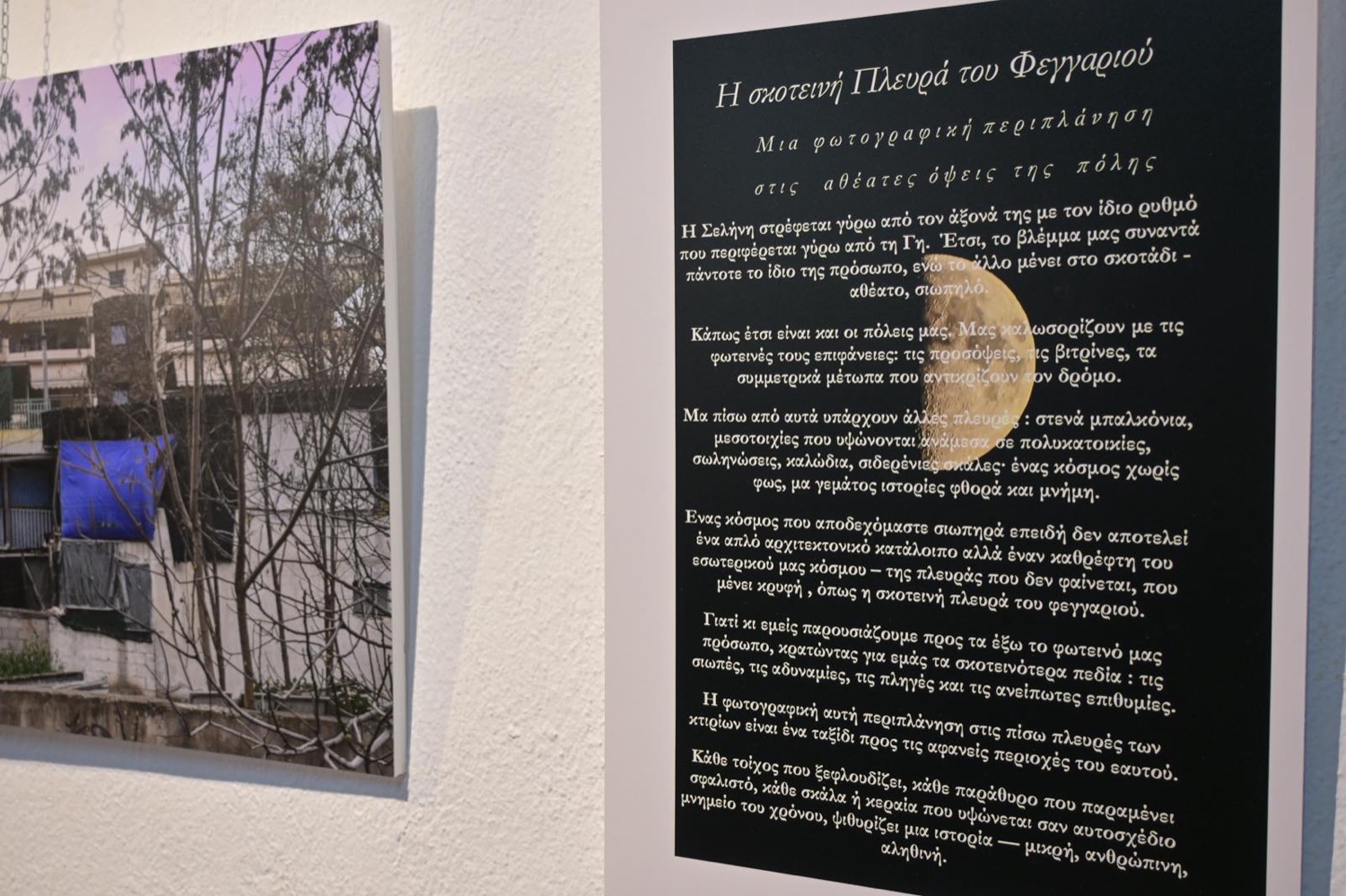Η έκθεση παρουσιάζει ένα φωτογραφικό αφήγημα που εστιάζει στις παραμελημένες πίσω όψεις της πόλης, αναδεικνύοντάς τες ως αντανάκλαση των αθέατων πλευρών της ανθρώπινης ύπαρξης. Μέσα από εικόνες φθοράς, ρωγμών και πρόχειρων παρεμβάσεων, ο καλλιτέχνης επιχειρεί έναν στοχασμό γύρω από τη σχέση του ορατού και του κρυμμένου, αξιοποιώντας τον συμβολισμό της σκοτεινής πλευράς του φεγγαριού ως μεταφορά της διπλής αστικής και ανθρώπινης ταυτότητας.