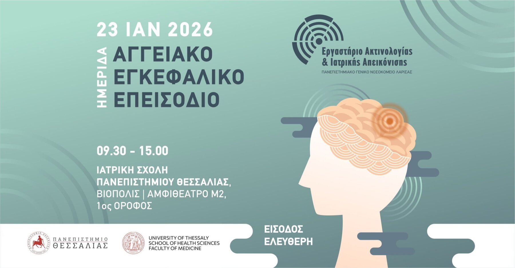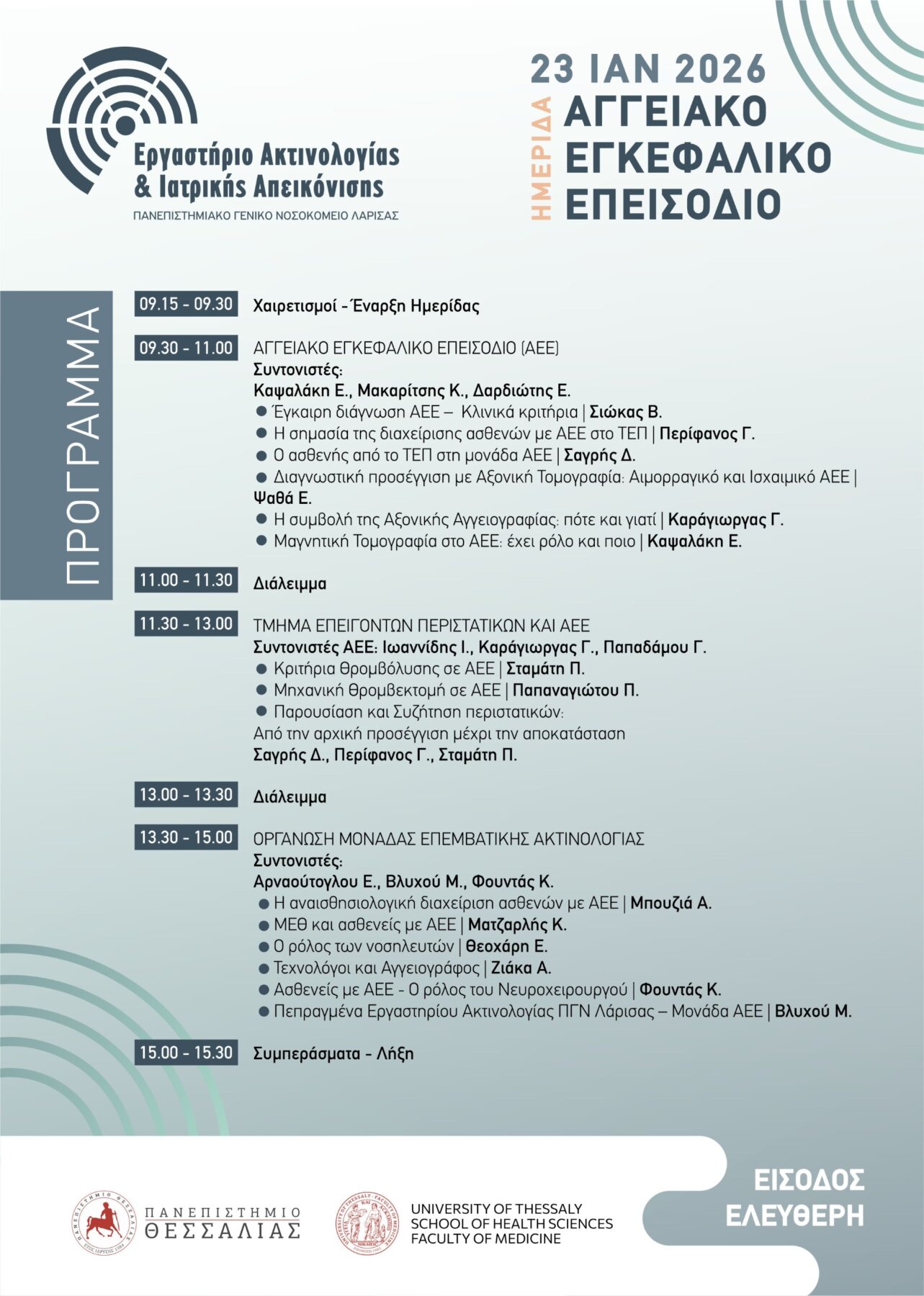Tο Εργαστήριο Ακτινολογίας και Ιατρικής Απεικόνισης του ΠΓΝ Λάρισας διοργανώνει ημερίδα με θέμα το Αγγειακό Εγκεφαλικό Επεισόδιο, την Παρασκευή 23 Ιανουαρίου 2026, στην Ιατρική Σχολή του Πανεπιστημίου Θεσσαλίας, Βιόπολις, Αμφιθέατρο Μ2.