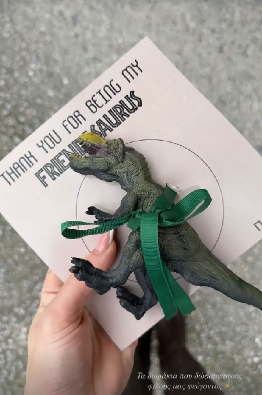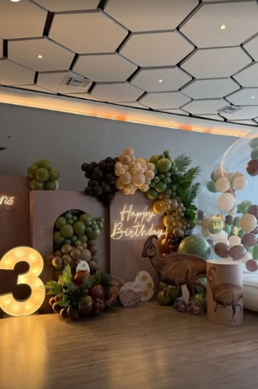 Η Ιωάννη Τούνη είχε ενοικιάσει έναν μεγάλο χώρο και τον διακόσμησε με μπαλόνια σε αποχρώσεις καφέ, λευκού, μπεζ και πράσινου, ακολουθώντας το θέμα των δεινοσαύρων.