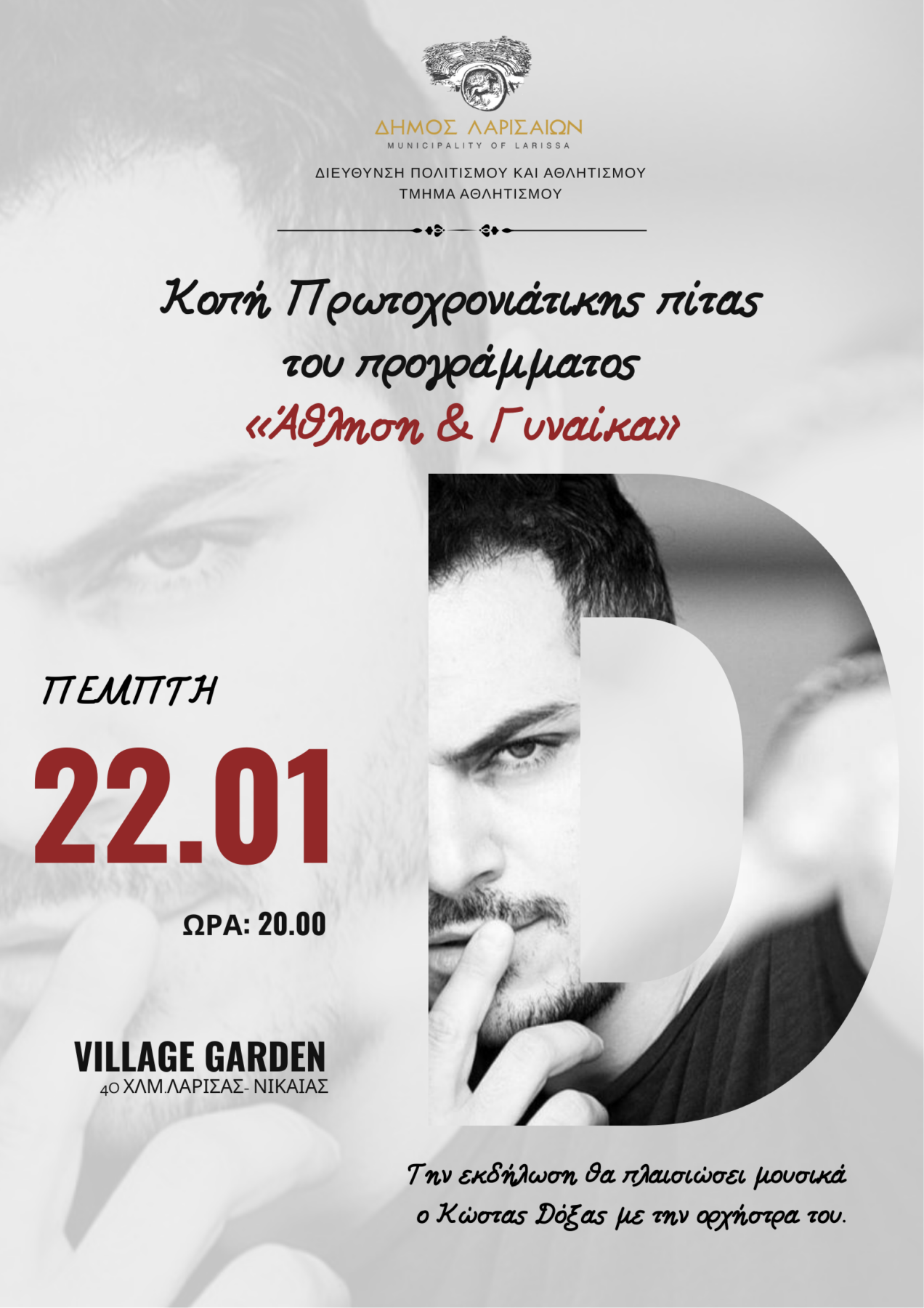 Ο αγαπημένος καλλιτέχνης Κώστας Δόξας θα πλαισιώσει μουσικά την κοπή της πρωτοχρονιάτικης πίτας του προγράμματος «Άθληση και Γυναίκα» του Δήμου Λαρισαίων, προσφέροντας μια ξεχωριστή βραδιά γεμάτη κέφι, μουσική και θετική ενέργεια. Με τη δυναμική σκηνική του παρουσία και το γνωστό του ρεπερτόριο, θα διασκεδάσει τις γυναίκες του προγράμματος και τις φίλες τους, συμβάλλοντας σε μια όμορφη γιορτή συνάντησης, χαράς και ανταλλαγής ευχών για τη νέα χρονιά.