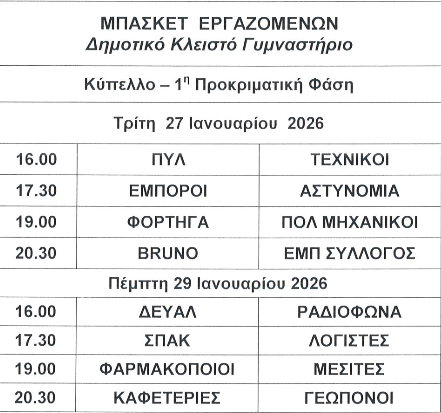 Το Τμήμα Αθλητισμού του Δήμου Λαρισαίων γνωστοποίησε τα ζευγάρια, τις ημερομηνίες και τις ώρες των αναμετρήσεων της πρώτης προκριματικής φάσης του πρωταθλήματος μπάσκετ εργαζομένων.