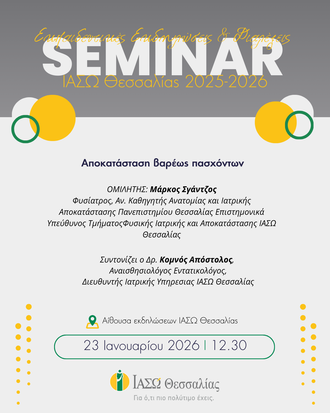 Επιστημονική διάλεξη στο ΙΑΣΩ Θεσσαλίας με θέμα: ”Αποκατάσταση βαρέως πασχόντων”